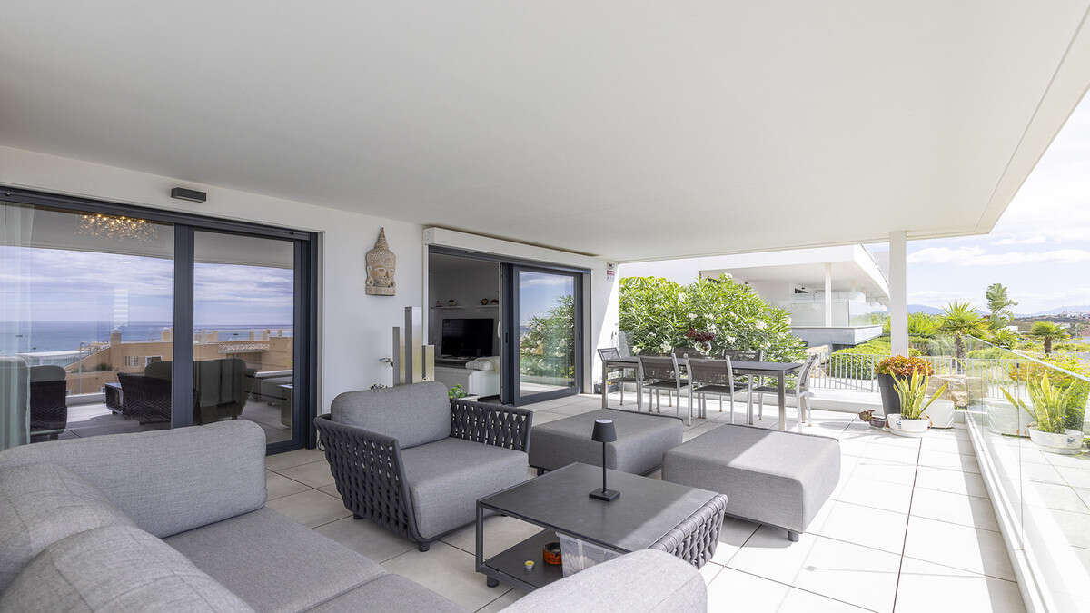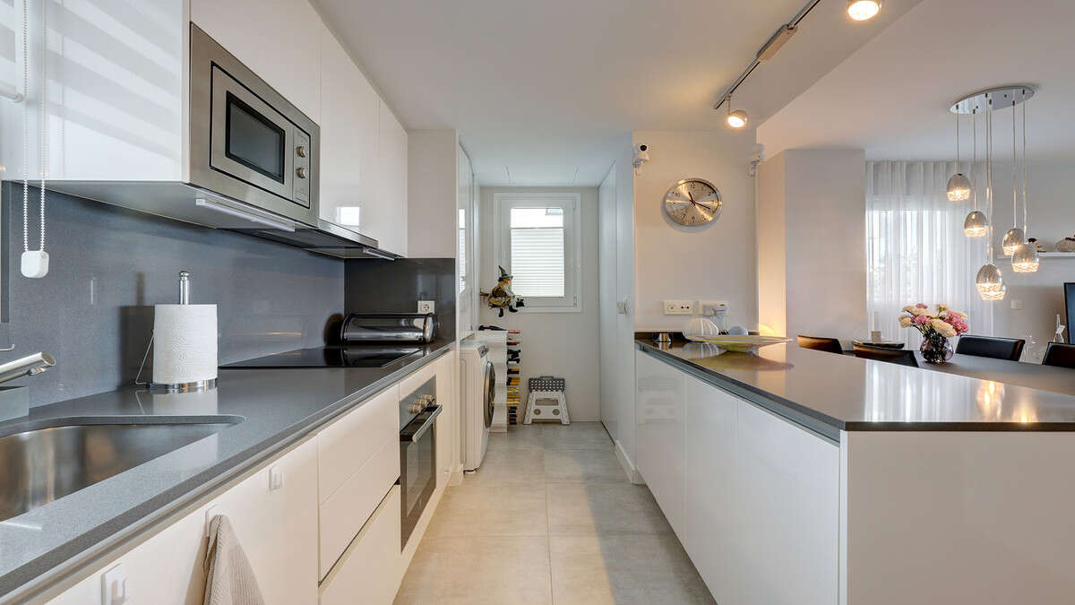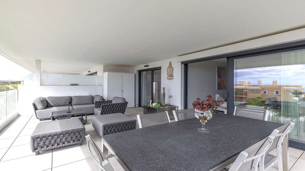 Straight ahead, the open-plan kitchen, dining, and living area is light-filled and modern, seamlessly leading out onto the large terrace, ideal for dining al fresco or enjoying the long, sunny Spanish afternoons while soaking in the stunning sea views.
