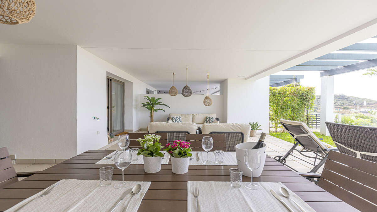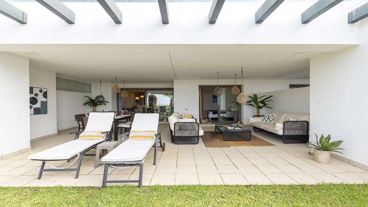 The living area flows seamlessly onto the apartment's standout feature: a stunning terrace and garden. Partly covered, this outdoor space is perfect for al fresco dining, relaxing in the Spanish sun, or simply enjoying the serene surroundings.