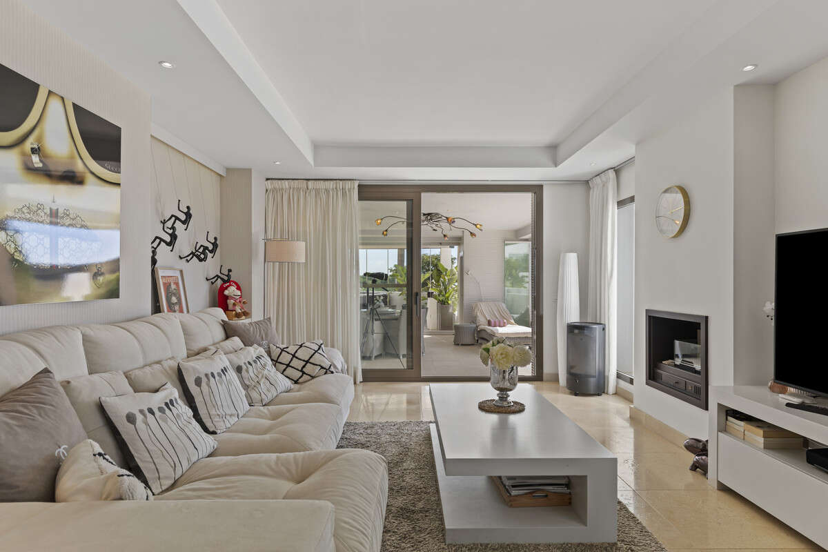 The open-plan, ultra-modern kitchen with a stylish breakfast bar flows effortlessly into the expansive living and dining area, where picture windows frame captivating sea, mountain, golf, and urban views. The south facing orientation ensures abundant sunlight throughout the day, highlighting the home's marble flooring, double glazing, and gas fireplace that together evoke comfort and sophistication.