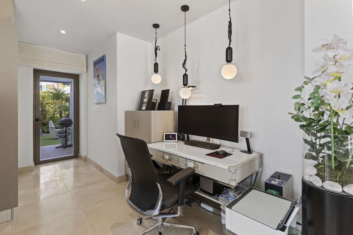 At the front, an enclosed outdoor living terrace with glass curtains serves as an elegant extension of the main living space—perfect for year-round enjoyment. Beyond, a further open terrace with a jacuzzi invites relaxation amid breathtaking panoramic views. At the rear, a peaceful garden terrace offers an intimate space to unwind. Additional features include air conditioning, ample wardrobe space, a dedicated office, private parking, a large storage room, and access to the resort's communal pool, gardens, and gym.