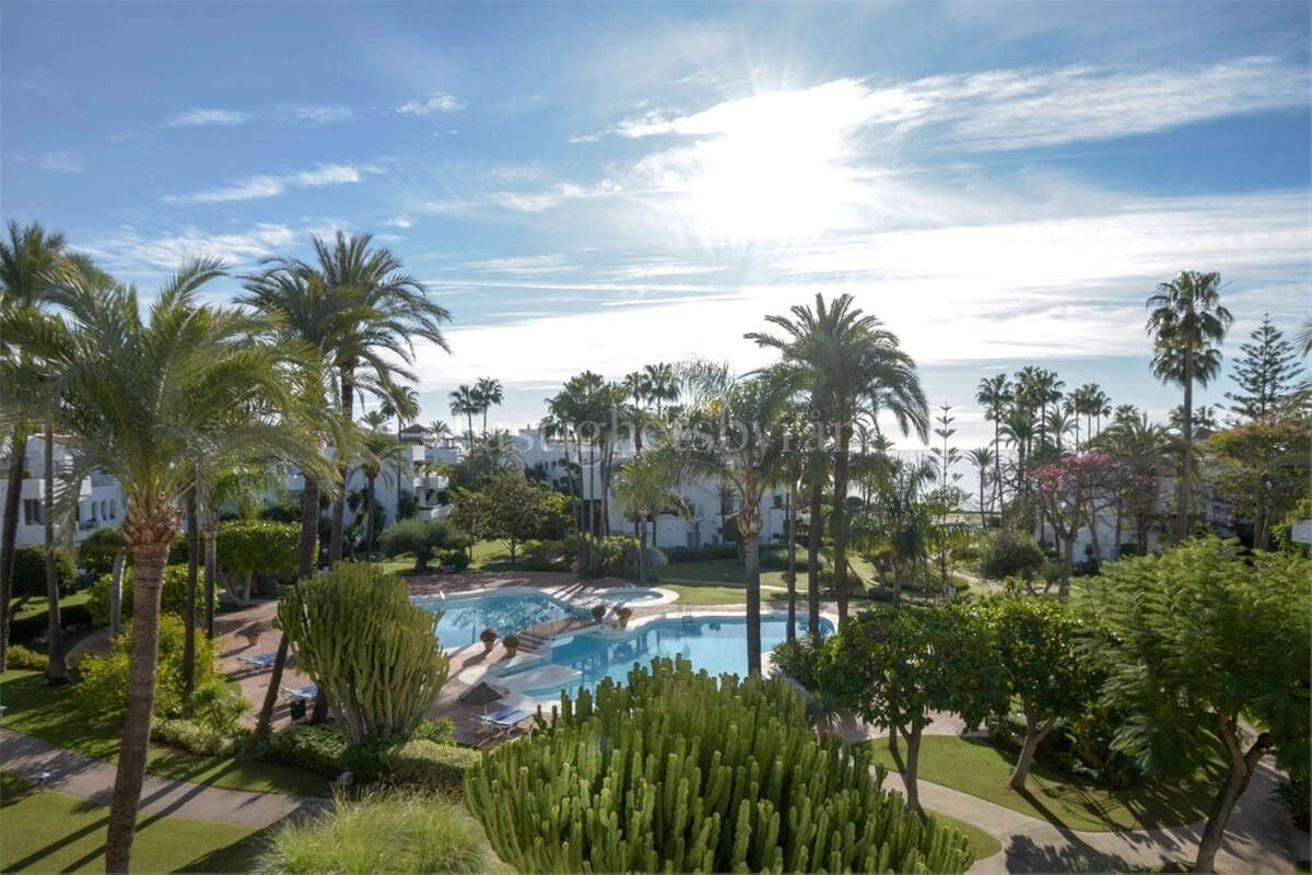 Alcazaba Beach magnificent apartment with large terrace, garden, swimming pool and partial views to the Mediterranean, in exclusive beachfront urbanization, with direct access to the beach, beach bar and restaurant on site, communal parking, 24 hour security, beautiful tropical gardens very well kept, 6 swimming pools (one heated), tennis and paddle courts. It is located on the outskirts of Estepona, with all kinds of services around and only 5 minutes drive from the marina and 10 minutes from Puerto Banus.