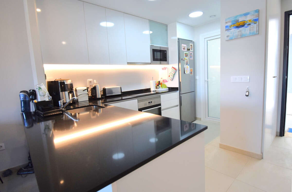 This West Facing, As New, Two Bedroom, Second Floor Apartment in Playa Flamenca, is located within a recently constructed and highly desirable resort, right in the heart of Orihuela Costa. Ideally positioned just a 8-minute walk to the beach, a 2-minute stroll to major chain supermarkets and café bars, and only 15 minutes to the popular La Zenia Boulevard shopping centre. Several top golf courses can also be reached within a 10-minute drive. Set within an impressive 17,000m2 resort, the complex boasts beautifully landscaped communal gardens, winding pathways, two heated swimming pools, three standard pools — one featuring a pool bar — two children's pools, six Jacuzzis, a fully equipped gym with panoramic views, sauna, chill-out zones, pond and fountains, a children's play area, walk and bike paths, and onsite commercial units offering added convenience. The apartment itself is modern, bright and open plan in design, featuring a spacious lounge/dining area with large double sliding glazed doors leading out to the terrace — the perfect spot to relax or dine al fresco. The sleek white fitted kitchen includes a breakfast bar and access to a separate utility room. There are two double bedrooms, both with built-in wardrobes, and the master benefits from direct access to the terrace and a stylish en suite shower room with door into the WC. Additional features include ducted air conditioning throughout, lift access within the block, and an allocated underground parking space. A stunning property in an exceptional setting — perfect for holidays, rental investment or full-time living on the Costa Blanca South.\n
