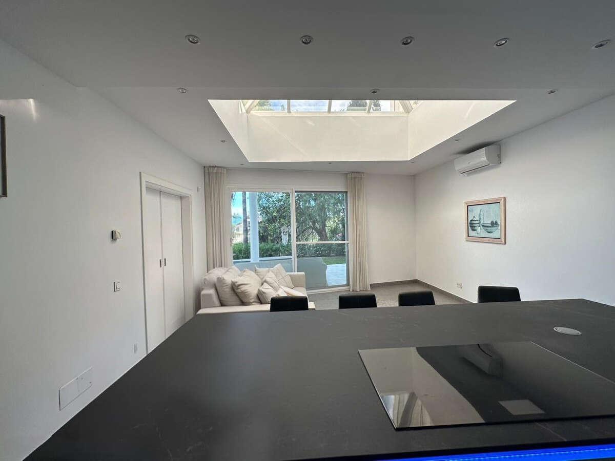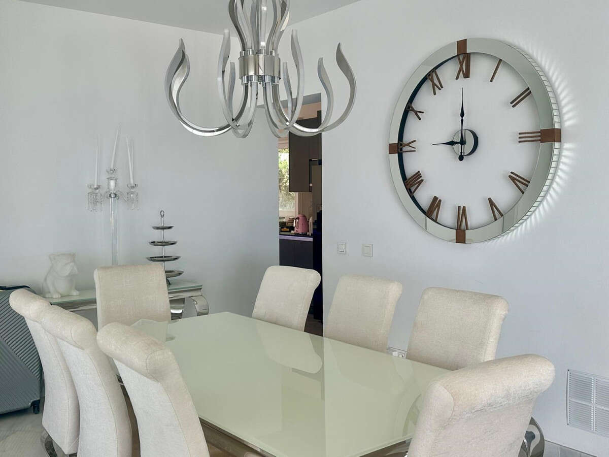 The residence features 4 bedrooms, 3 of which have en-suite bathrooms, as well as an additional guest toilet, guaranteeing comfort and privacy for its residents. The common areas include a spacious living room with a fireplace, a separate dining room, and a modern open-plan kitchen that is fully equipped. The interior boasts high-end finishes such as marble floors, fitted wardrobes, and a walk-in closet, along with convenient amenities like air conditioning, heating, and electric blinds.