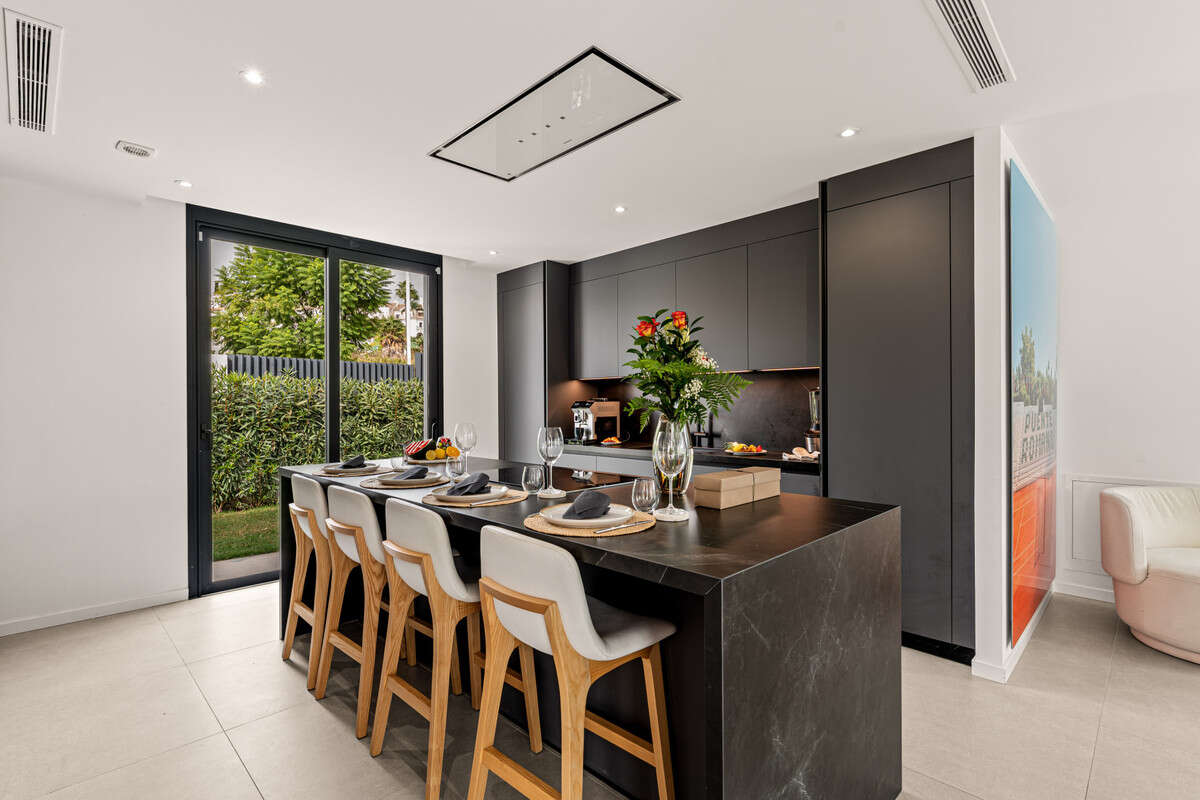 The home features five spacious bedrooms, four of them en suite, along with three additional bathrooms and a guest toilet. Interiors highlight a minimalist yet warm aesthetic, enhanced by high-quality finishes and carefully selected furnishings. At the heart of the villa is an open-plan kitchen and living area. The kitchen, equipped with premium Miele appliances, reflects innovation and quality, while the living space extends seamlessly to a terrace with views of the lush fairways. This integration of indoor and outdoor spaces makes the villa ideal for relaxed family living as well as larger gatherings.