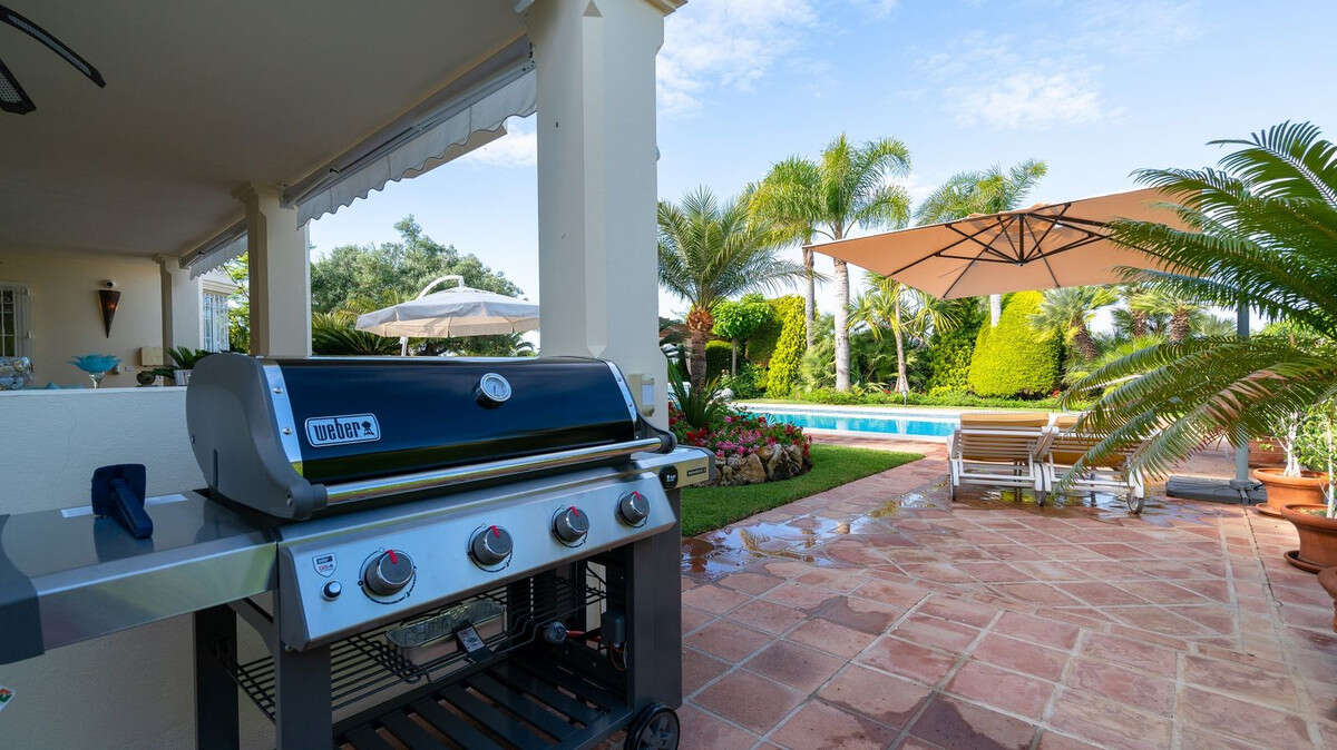 A large entrance hall opens onto a formal dining and living area with a spectacular view over the gardens and pool area. An additional study/TV-room with an elegant open fireplace to take advantage of the few cold days enhances the feeling of cosiness together with the immense kitchen, providing the necessary equipment to take pleasure in home cooking.