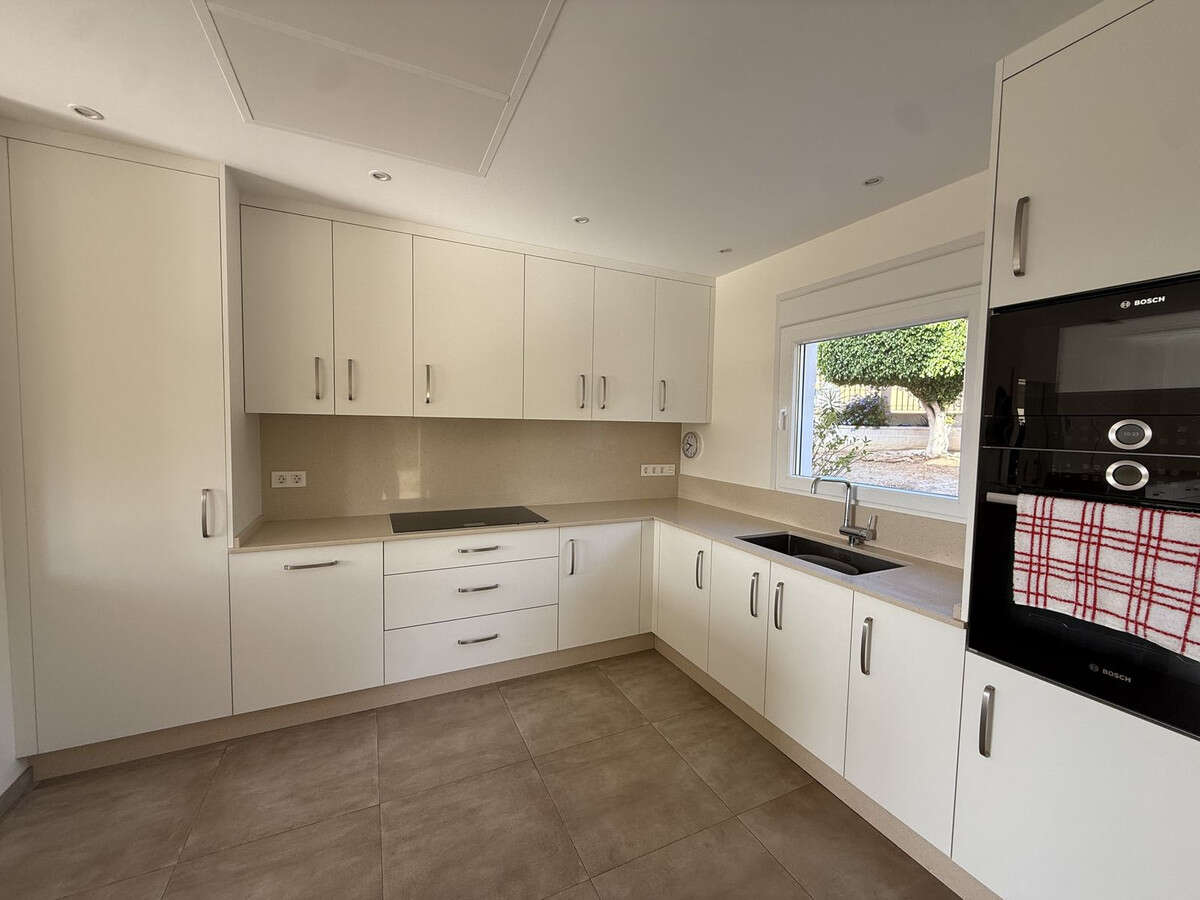 The large living room of approximately 50M2 has an open fire place, fully air-conditioned hot and cold throughout the house, large kitchen diner with a utility room, from the living room and kitchen you can access the wrap around terrace, and part of the terrace has been covered to give shade in the summer time. Again, you have sea views from the living room and terrace.