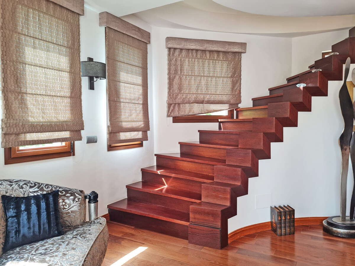 The lower level offers two additional bedrooms and an entertainment area with a home cinema. Outside, the lush garden is a private oasis, featuring a stunning pool with a sun deck, and ample space for relaxation.