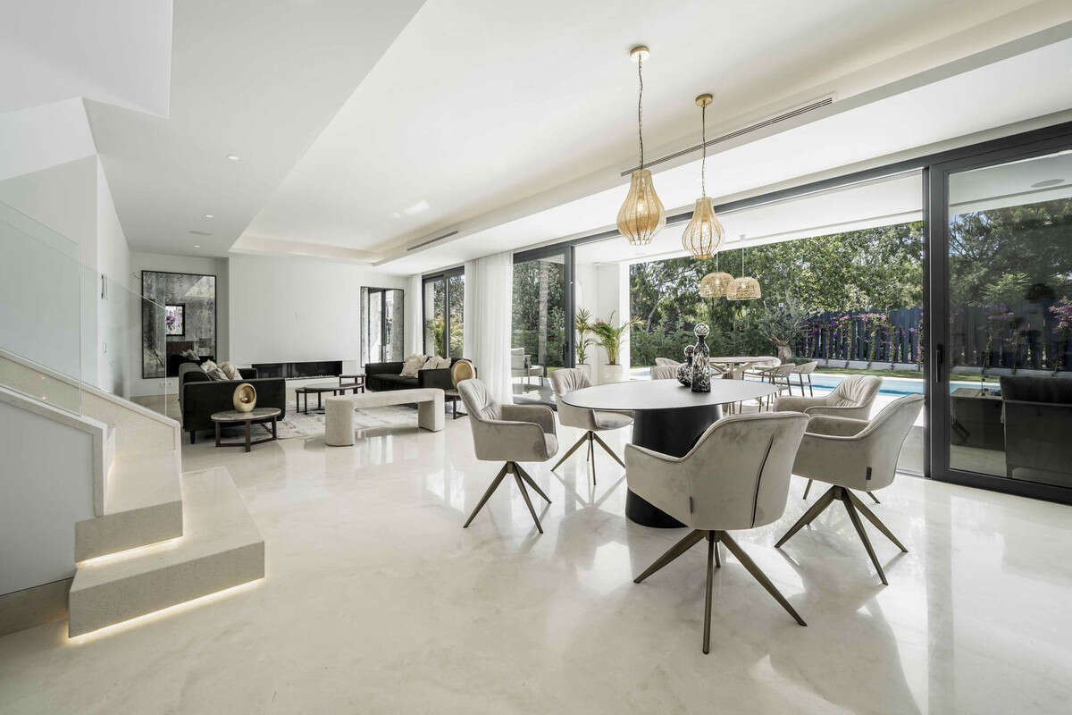 The villa is located in the renowned and tranquil district of El Campanario Golf, nestled between Marbella and Estepona, along the New Golden Mile. The property enjoys an excellent location, just one kilometer from the sunny beach and only a 10-minute drive from Puerto Banús. The area is characterized by luxurious villas and apartments, all surrounded by lush greenery.