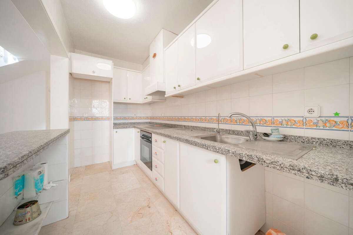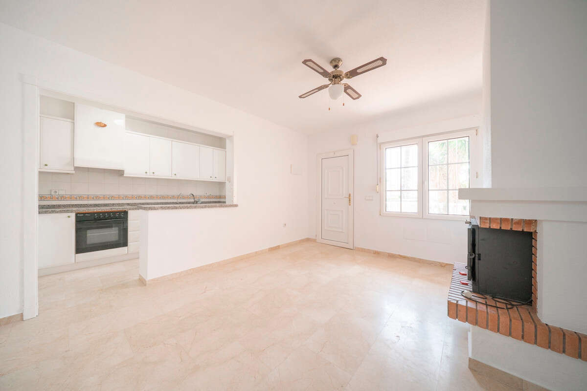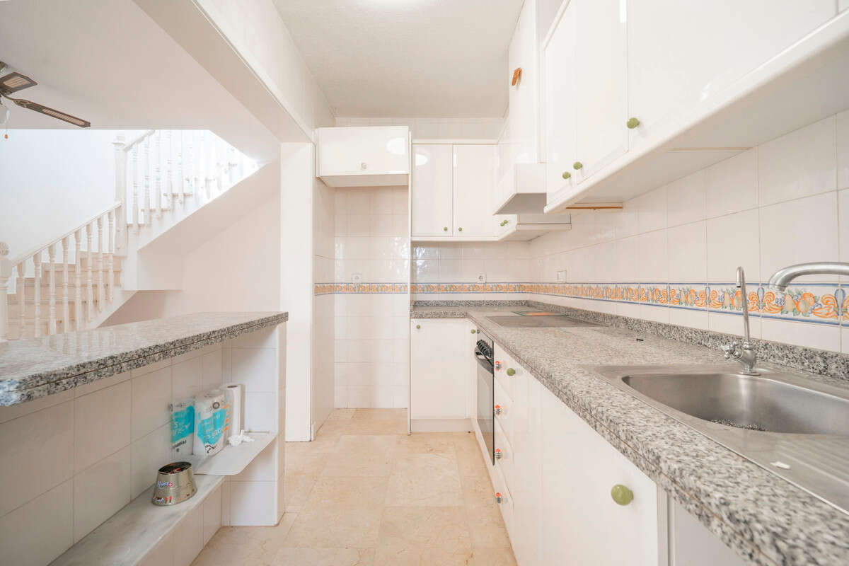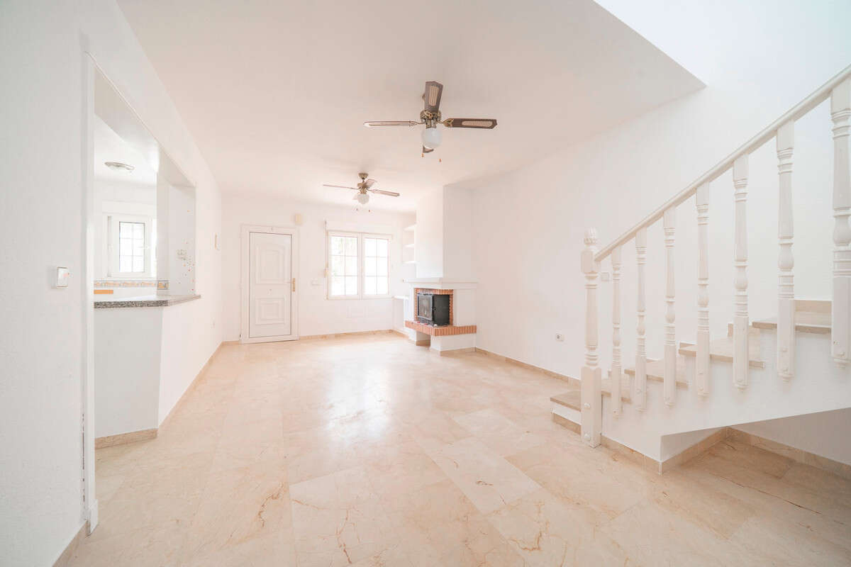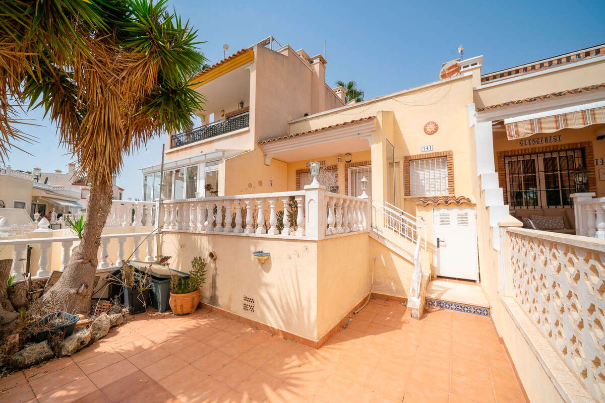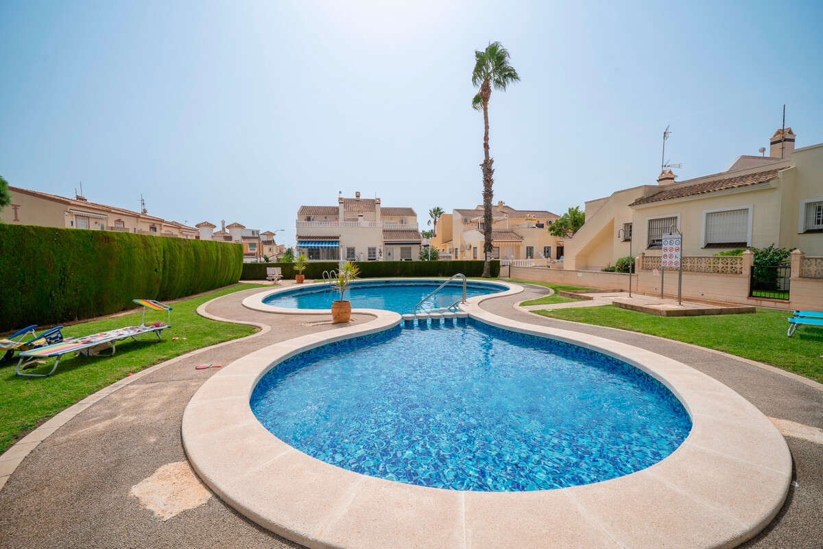 This bungalow is located in Residencial Flamenca Beach, Phase 8, one of the most sought-after areas of Orihuela Costa, with a communal pool and pleasant garden spaces.The property features three bedrooms and two bathrooms. Upon entering, you pass through a front patio that leads to a slightly elevated terrace overlooking the common areas and pool. From there, you enter directly into the living room, a cozy space with a fireplace that connects to the kitchen via a practical breakfast bar. On the same floor, there is a full bathroom and two bedrooms with built-in wardrobes, one of them with access to the rear patio through a large window.From the living room, stairs lead to the third attic-style bedroom, which has an en-suite bathroom and access to a private southeast-facing terrace, also overlooking the pool and communal areas.Built in 1999, this property offers 99.56 m² built and 89.53 m² usable, making it ideal both as a permanent residence and for enjoying holidays on the Costa Blanca.