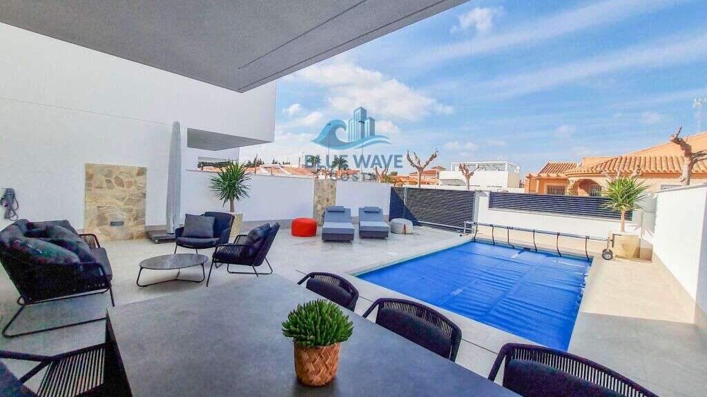 This property is located in San Pedro del Pinatar, in the distinguished Los Antolinos neighborhood, a well-established area with close service and a peaceful setting by the coast. This two-story single-family home offers a practical and functional layout, designed for family life. The ground floor features a spacious bedroom and full bathroom, ideal for guests or as an office. The upper floor houses the two remaining bedrooms and bathrooms, with a comfortable and well-designed layout. The building is maintained in optimal condition, with modern finishes and comfortable solutions that facilitate daily living. The total constructed area is 112.50 m2, with 93.95 m2 usable area that optimizes each space. Its layout includes three bedrooms and three bathrooms, providing comfort for families or entertaining guests. The living-dining room connects to a 45.30 m2 terrace and, in turn, to a 99.77 m2 garden, offering a balance between indoor and outdoor areas. The home is equipped with heat pump heating and air conditioning, ensuring thermal comfort throughout the year. It features built-in wardrobes in the bedrooms and a laundry room for easy housekeeping. The fully functional kitchen is integrated into the home and is served by water, electricity, and gas networks ready for immediate use. Its amenities include a private pool, providing added value for family and social enjoyment, especially during the summer months. The garage offers covered space for one car and additional storage. The property is delivered furnished, making it easy to move in and maintain from the very beginning. All this is complemented by a meticulous aesthetic and quality finishes that provide a sense of comfort and functionality. The Los Antolinos area is characterized by its proximity to the sea, restaurants, supermarkets, and sports centers, as well as its good access to the region's main thoroughfares. From this location, you can enjoy the area's popular beaches, as well as walks and outdoor activities year-round. Blue Wave Costa's offering presents this property as an attractive option for those who prioritize comfortable living, with a remarkable ease of everyday living and stable investment potential in a constantly sought-after area. If you would like to learn more about the specifications, exact dimensions, and viewing options, we would be happy to arrange a viewing. Contact Blue Wave Costa to schedule an appointment and receive all the information you need to consider this opportunity.