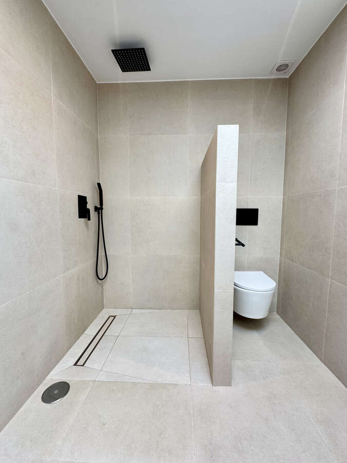 The custom kitchen features a nicely contoured island and top-of-the-line Bertazzoni appliances. The bathroom walls and outdoor areas are covered with 60x60 beige porcelain tiles, which are used throughout the design to provide coherence. The two bathrooms' sleek black features and skylights give them the ideal modern touch, and you can truly live comfortably in the sun here.
