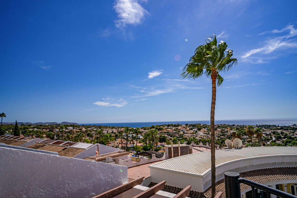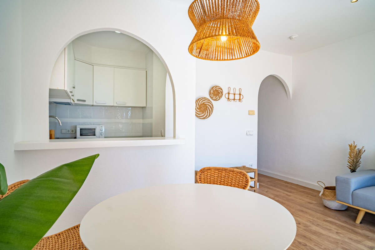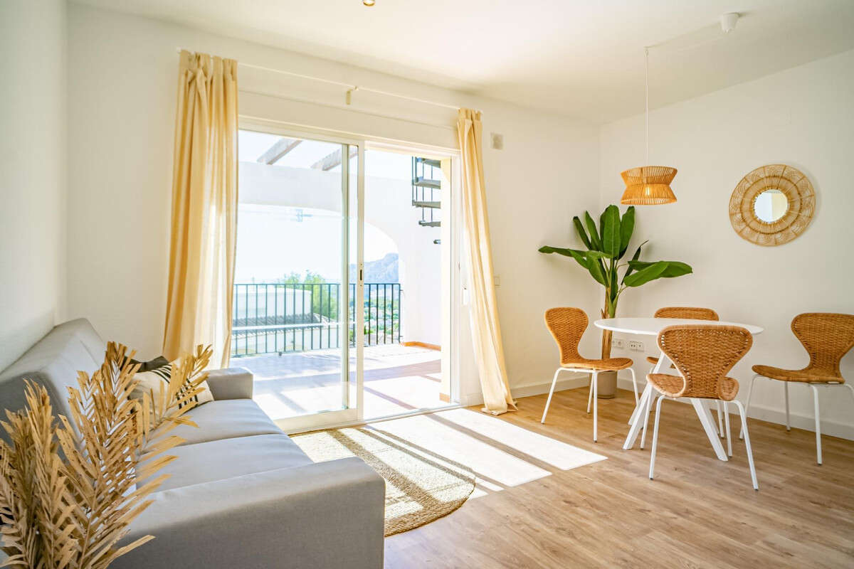 This apartment is part of a residential complex with 200 homes, located approximately 10 minutes from the center of Calpe and the sea. The apartment features a spacious bedroom, a full bathroom, a semi-open kitchen, and a living/dining room. From the living room, you can access a large terrace with stunning views of the sea and the Peñón (rock), and from this terrace, you can go up to a 23 m² solarium.
