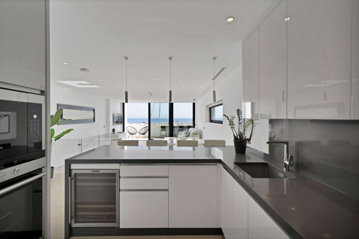 The duplex is arranged over two levels. The lower floor comprises two spacious bedrooms, each with its own en suite bathroom, offering privacy and comfort. The main floor features a stylish open plan fully equipped kitchen, a bright living and dining area, and a generous terrace with panoramic open sea views. A guest toilet and air conditioning are also located on this level.