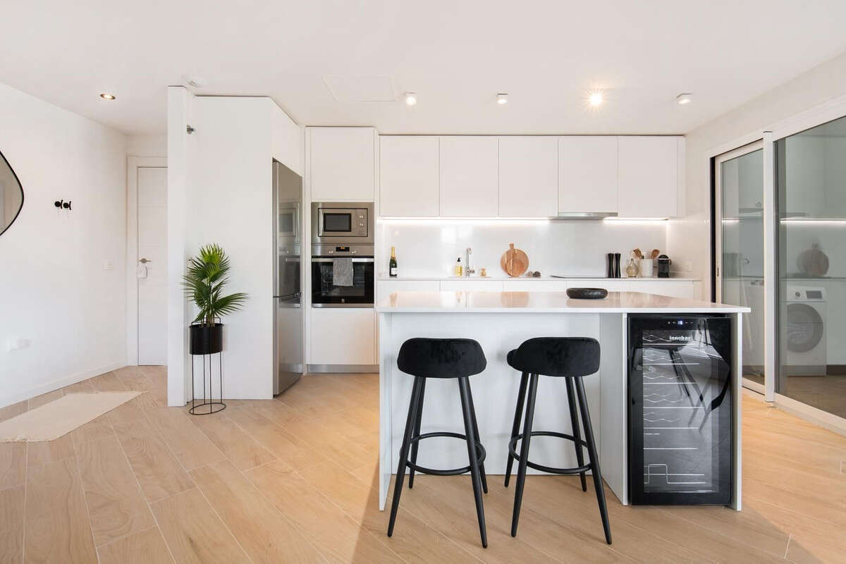 The apartment features a bright open-plan living and dining area, seamlessly connected to a sleek, fully fitted designer kitchen with premium appliances, clean lines, and a central island - perfect for both everyday living and entertaining. Floor-to-ceiling sliding doors flood the interior with natural light and open onto a generous private terrace, where open views over greenery, the surrounding area, and distant mountains create a serene Mediterranean atmosphere.