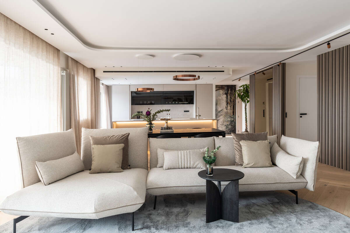 The main living area is designed for seamless day-to-day enjoyment and entertaining. The open-plan layout connects a spacious lounge and an elegantly appointed kitchen equipped with a large island, creating a natural hub for family gatherings and dinner parties. The kitchen showcases top-of-the-line appliances from BORA, Siemens, and Bosch, along with sleek custom Santos cabinetry and refined Grey Balear stone countertops, offering both aesthetic appeal and practical functionality.