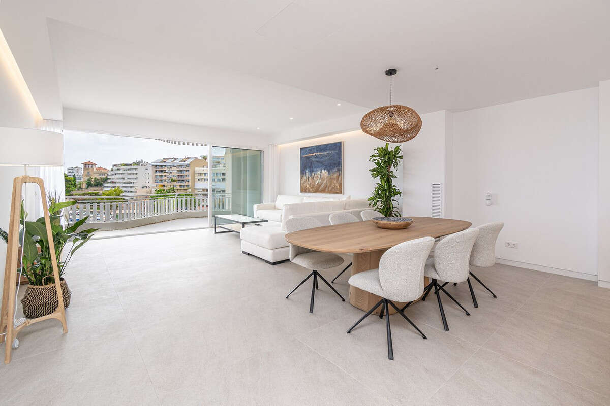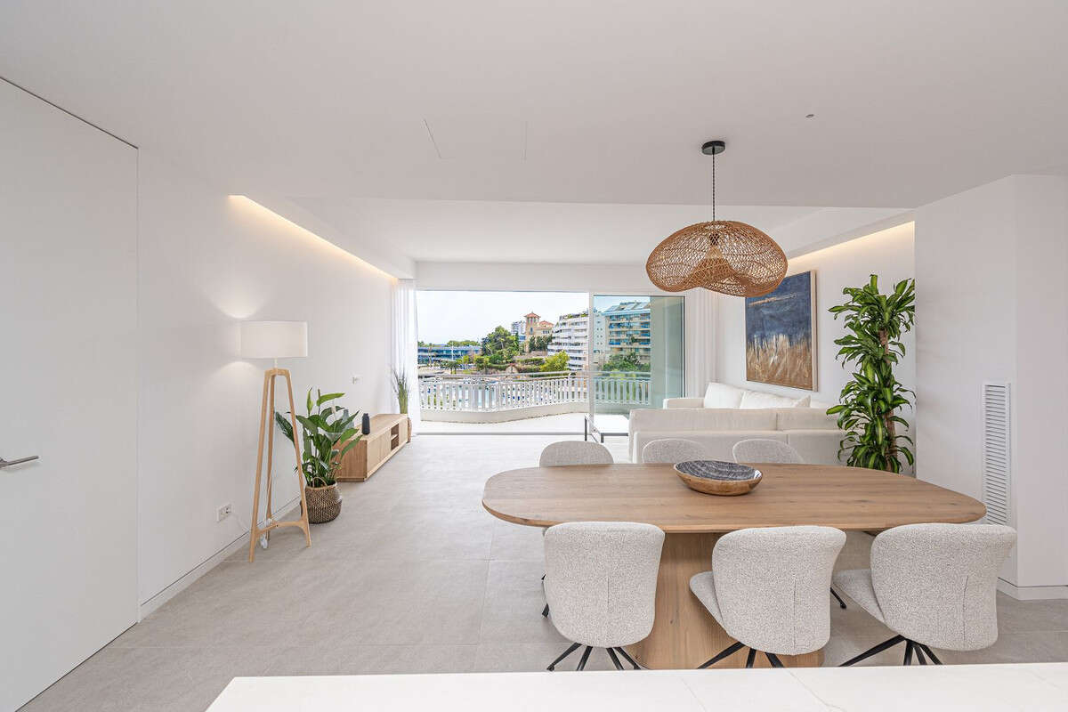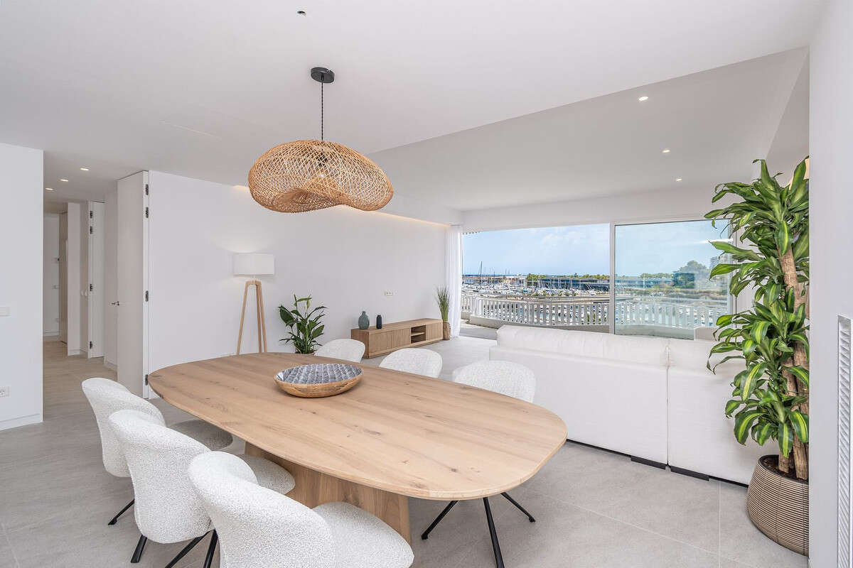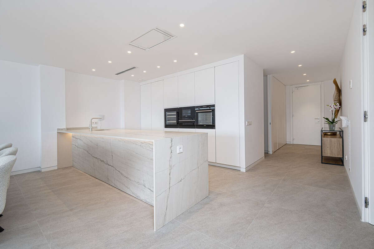 Beautiful apartment in Can Barbara Palma with views, large living room with open-plan kitchen of 60 m2, has 3 bedrooms, two with views and three bathrooms, one en suite, the kitchen is equipped with Siamens appliances and has invisible induction cooking surface, water softener and reverse osmosis system, the floors are large format 100x 100 porcelain, white lacquered interior carpentry with doors flush with the wall to the ceiling, with invisible hinges and magnetic lock, the skirting boards are invisible flush with the wall, the built-in wardrobes, lined and with lighting, the toilets and bathroom furniture are suspended, PVC exterior carpentry with motorized blinds, double glazing with 4 + 4.2 low-emissivity glass, gas chamber and solar control. Air conditioning and production of domestic hot water by high-performance Aerotermia system, the air conditioning is through ducts and the mechanical ventilation system It also has a terrace and porch, and garage service is included in the price.