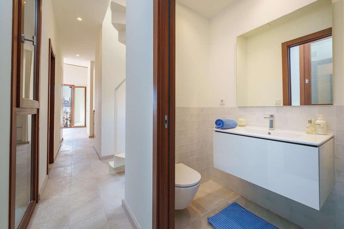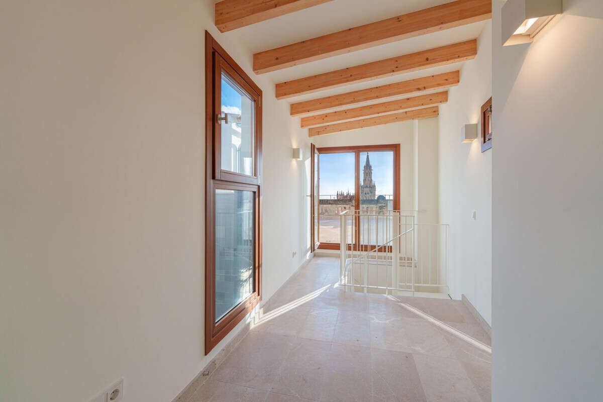 A true highlight of the property is the upper level, accessed via an elegant spiral staircase. Here, you will find an impressive private rooftop terrace with an adjoining enclosed space, ideal for creating a summer kitchen or additional lounge area. From this elevated position, the panoramic views extend across the rooftops of the Old Town to the cathedral, Santa Eulalia Church, Bellver Castle, the Mediterranean Sea, and the surrounding mountains, creating a truly unique outlook. The spacious terrace provides the perfect setting for sunbathing, entertaining guests, or enjoying warm Mediterranean evenings under the open sky.