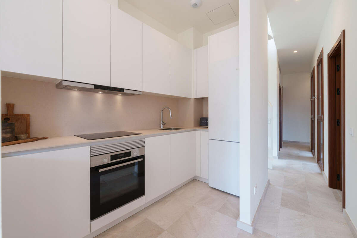 The penthouse has been recently renovated with great attention to detail, seamlessly combining contemporary design with the character of a traditional Mallorcan building. The main living level features a bright and open living and dining area with an integrated kitchen and charming views towards Santa Eulalia. The layout includes two generous double bedrooms, a single bedroom, two bathrooms — one en suite — and a convenient storage room with a laundry area.