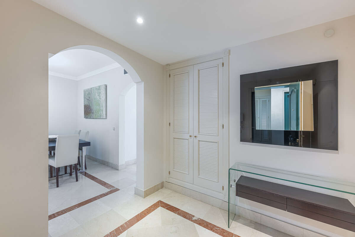 Located in Marbella's prestigious Golden Mile, this elegant apartment offers a rare combination of prime location, comfort, and Mediterranean lifestyle. Set within the sought-after Jardín del Mediterráneo community, it is just a short stroll from the beachfront promenade and within walking distance of Marbella's charming Old Town. Here, the শান্ত and privacy of a gated residential setting blend seamlessly with the vibrant social and culinary scene of beachfront restaurants, cafés, and chiringuitos.
