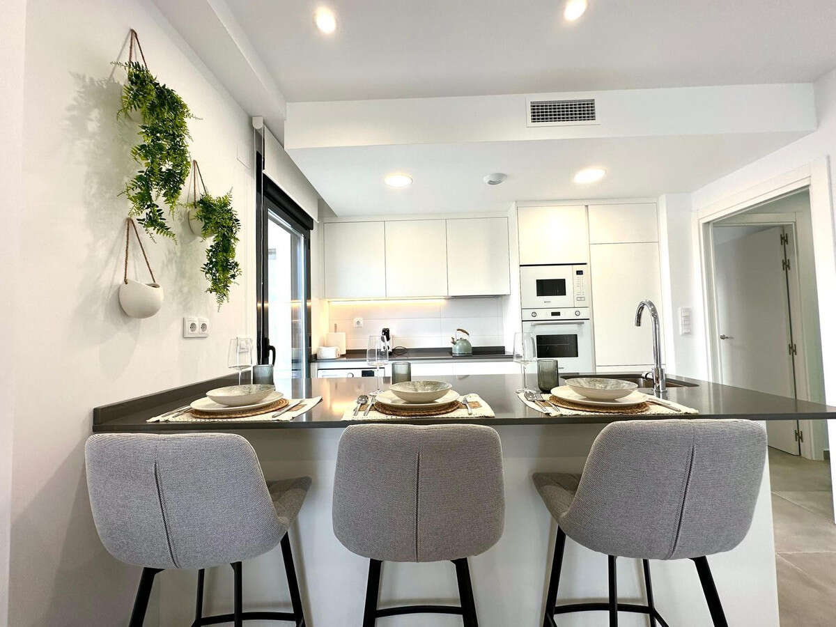 This modern, west-facing apartment is filled with natural light and offers a spacious, open-plan layout. The living and dining area seamlessly connects to a fully equipped kitchen and opens out to a large private terrace – ideal for enjoying sunset views over the pool and landscaped gardens. Air conditioning throughout ensures comfort in every season.