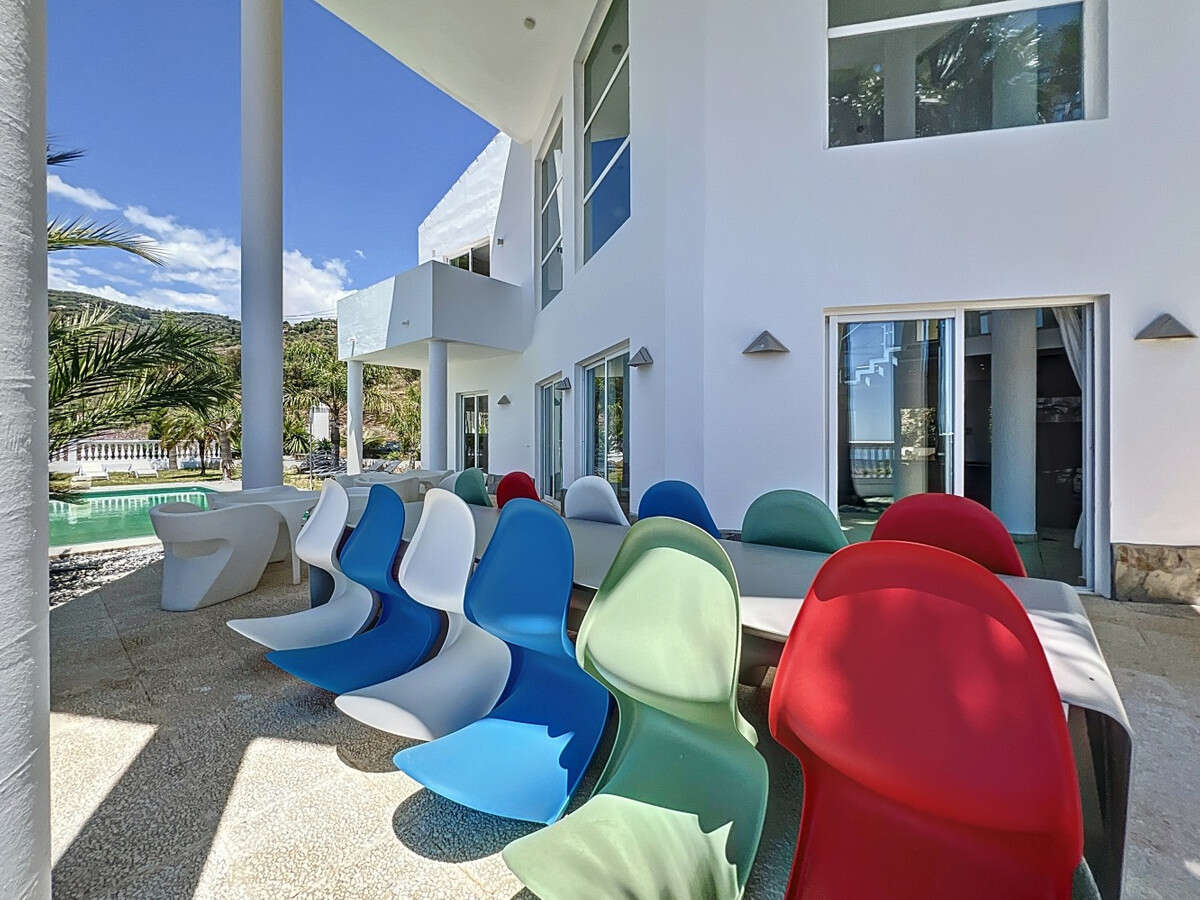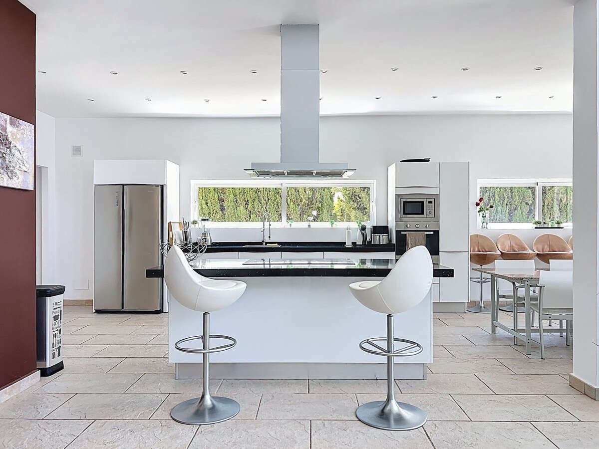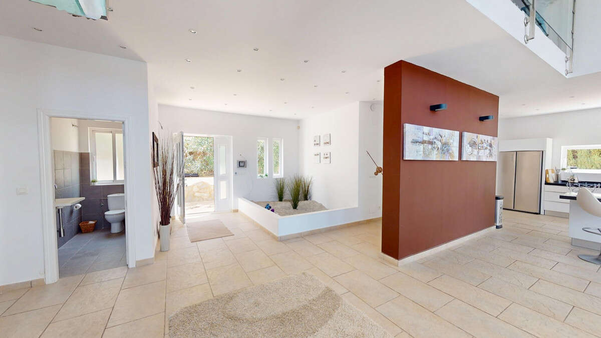 This impressive villa in Málaga, Spain, offers a harmonious blend of space, luxury, and modern design. Spanning 395.8 m2 across two floors, the property boasts 7 bedrooms and 5 bathrooms, making it ideal for large families or those who love to entertain. The ground floor, measuring 212.7 m2, features a stunning open-plan living area with soaring double-height ceilings. Floor-to-ceiling windows and sliding glass doors flood the space with natural light and provide seamless indoor-outdoor living. The living room is anchored by a sleek fireplace and complemented by comfortable, contemporary furnishings. The state-of-the-art kitchen is a chef's dream, featuring gleaming white cabinetry, high-end appliances, and a generous island with bar seating. Large windows offer picturesque views of the surrounding landscape while preparing meals. A unique feature of the ground floor is an indoor zen garden, complete with sand and decorative plants, adding a touch of tranquility to the space. The hallways are wide and well-lit, with carefully curated artwork adorning the walls. Ascending to the second floor via a modern staircase with glass balustrades, you'll find 183.0 m2 of additional living space. The primary bedroom, a spacious 26.9 m2, offers stunning views and an en-suite bathroom. The bathrooms throughout the property are sleek and modern, with large format tiles, walk-in showers, and contemporary fixtures. Some feature unique design elements like newspaper-print shower curtains, adding a playful touch to the otherwise minimalist aesthetic. Outside, the property benefits from its elevated position, offering panoramic views of the surrounding mountains and countryside, as well as the sparkling Mediterranean Sea. The outdoor area features a large swimming pool, perfect for relaxing or entertaining while enjoying the breathtaking scenery. The property offers easy access, ensuring a smooth connection to nearby amenities and attractions. Large terraces provide ample space for outdoor relaxation and entertainment, making this villa the ideal space for enjoying the Spanish climate in style. Throughout the villa, the color palette is predominantly white, creating a bright, airy atmosphere that's perfectly suited to the Spanish climate. Pops of color in furnishings and artwork add visual interest without overwhelming the serene ambiance. This villa represents the pinnacle of modern Spanish living, combining spacious interiors, high-end finishes, and breathtaking views in one impressive package a true dream home. We are pleased to be able to present this dream property to you soon, either personally or via virtual viewing. Because this world is unique - just like our Axarquía. In Andalusia. On the Costa del Sol. Here, on the sunny side of life...