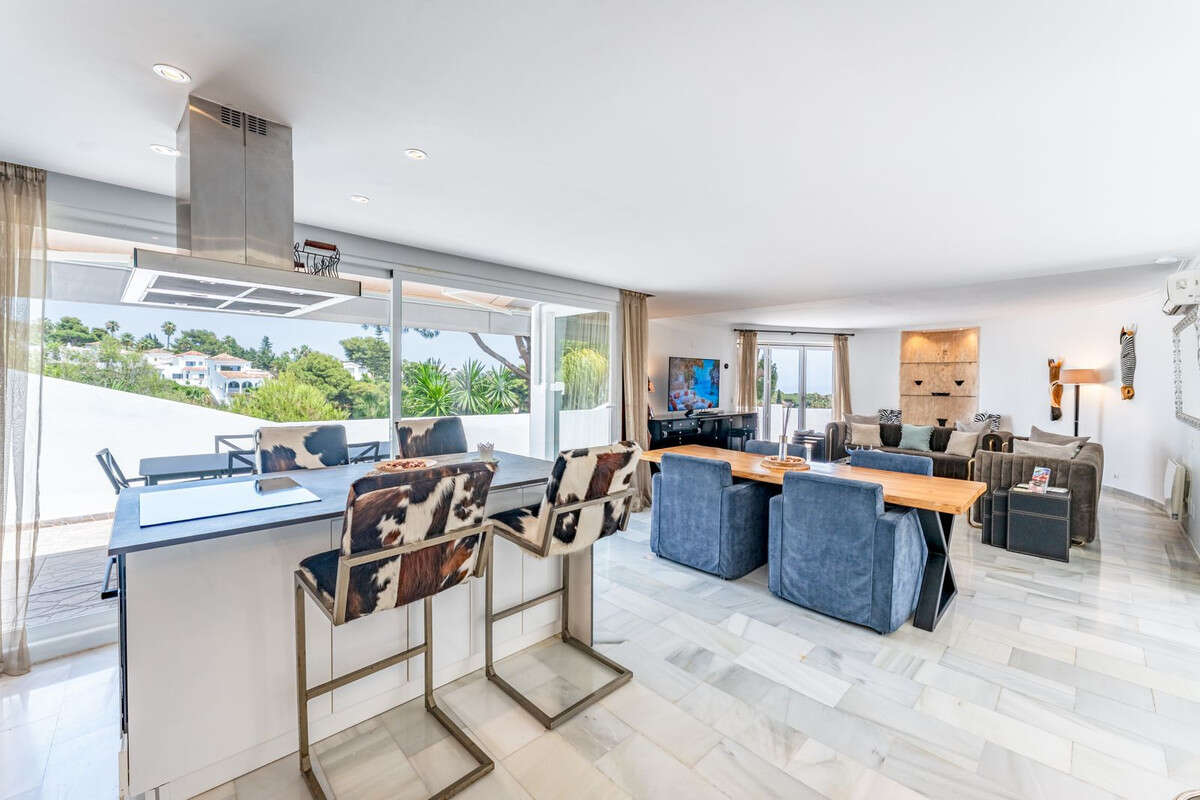 Stunning luxury villa located in the lower part of Calahonda, in an exclusive cul-de-sac surrounded by villas and in a very quiet residential area, just 800 meters from the beach, close to a beautiful natural green area of Calahonda, with breathtaking panoramic views of the sea and mountains. The property sits on a 715 m² plot and offers 232 m² of interior space plus a 70 m² terrace, fully enclosed, equipped with an alarm system and a private garage. The villa features four elegant bedrooms with king-size beds and en-suite bathrooms, marble floors throughout the house, double-glazed PVC windows and doors that provide exceptional natural light in every room. The furniture has been carefully selected and stands out for its sophisticated style and high quality. There are two dining areas — indoor and outdoor — perfect for entertaining. Outside, you'll find a large heated swimming pool with wooden decking, sun loungers, a chill-out area, and open views that invite absolute relaxation. On the rooftop, the spacious solarium offers a fully equipped bar, barbecue area, jacuzzi, and bar stools — ideal for enjoying unforgettable sunsets by the sea. Additionally, the villa holds a tourist rental license and is successfully rented most of the year, making it an excellent investment with high rental potential. A unique property that combines luxury, comfort, and a privileged natural setting on the Costa del Sol.