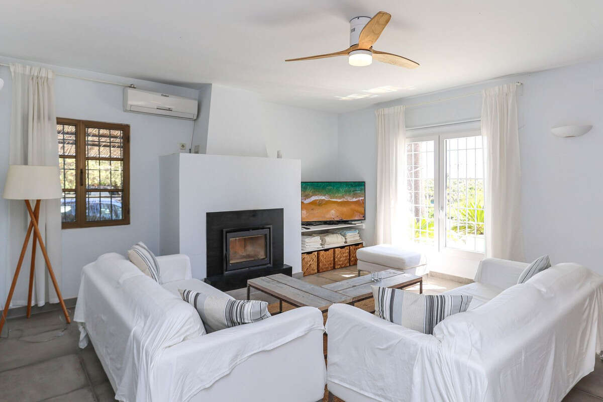 Inside, the villa feels refreshingly cool and inviting. The lounge centers around a striking fireplace, adding a cozy touch for winter evenings. The open-plan kitchen seamlessly connects to the living area and extends out to a covered dining terrace, perfectly positioned to overlook the pool.