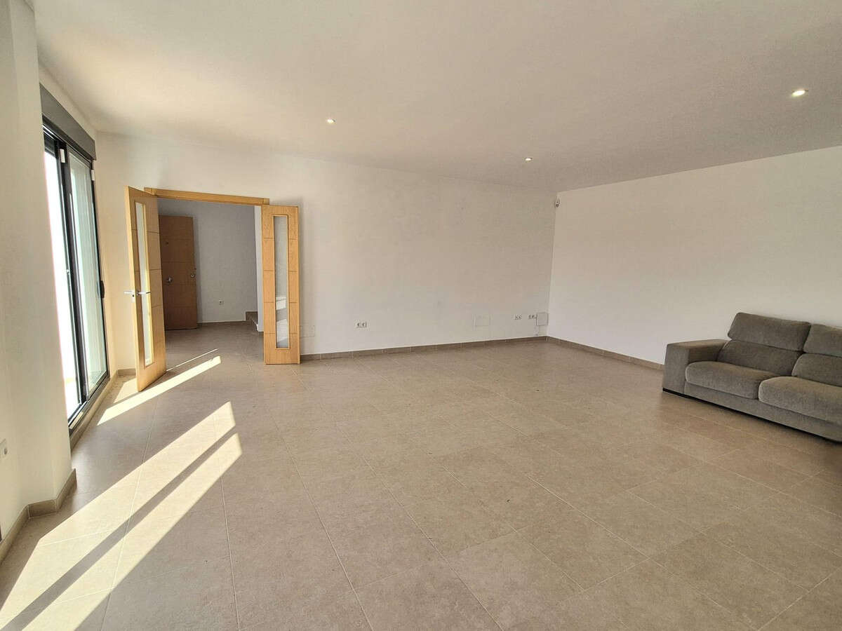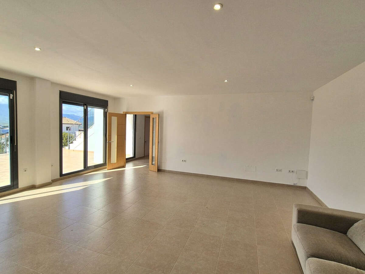 From the garage you go up the stairs to the living floor. From the stairs to the right you have a full bathroom, a spacious living / dining room with plenty of natural light coming in from the large sliding doors and a spacious kitchen with room for a seating area. The living room and kitchen can be opened up into an open floor plan.These areas have access to a huge terrace where the pool is located. There is also outside stairs that takes you up to the second level terrace. Following the internal stairs to the second floor, you have a storage room, a fully equipped bathroom to share between the 2 bedrooms (with built in wardrobes) and at the end of the corridor you will find the master bedroom with a walk in closet and a huge bathroom with separate shower and jacuzzi bath. Both bathrooms on this level have sky lights and all three bedrooms lead out onto another large terrace with great views over the urbanisation, mountains, Coin and you will see the amazing sunsets. From this terrace you can take the external stairs onto the roof of the villa. Here you for example can put solar panels or make another terrace.