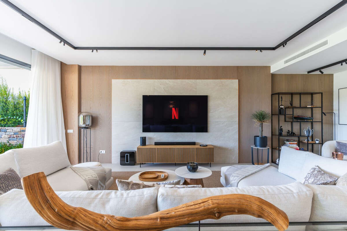 At the heart of the home is a bright open-plan living and dining area. Large windows lead directly to the terrace and private garden, allowing you to fully enjoy natural light and the Mediterranean climate all year round.