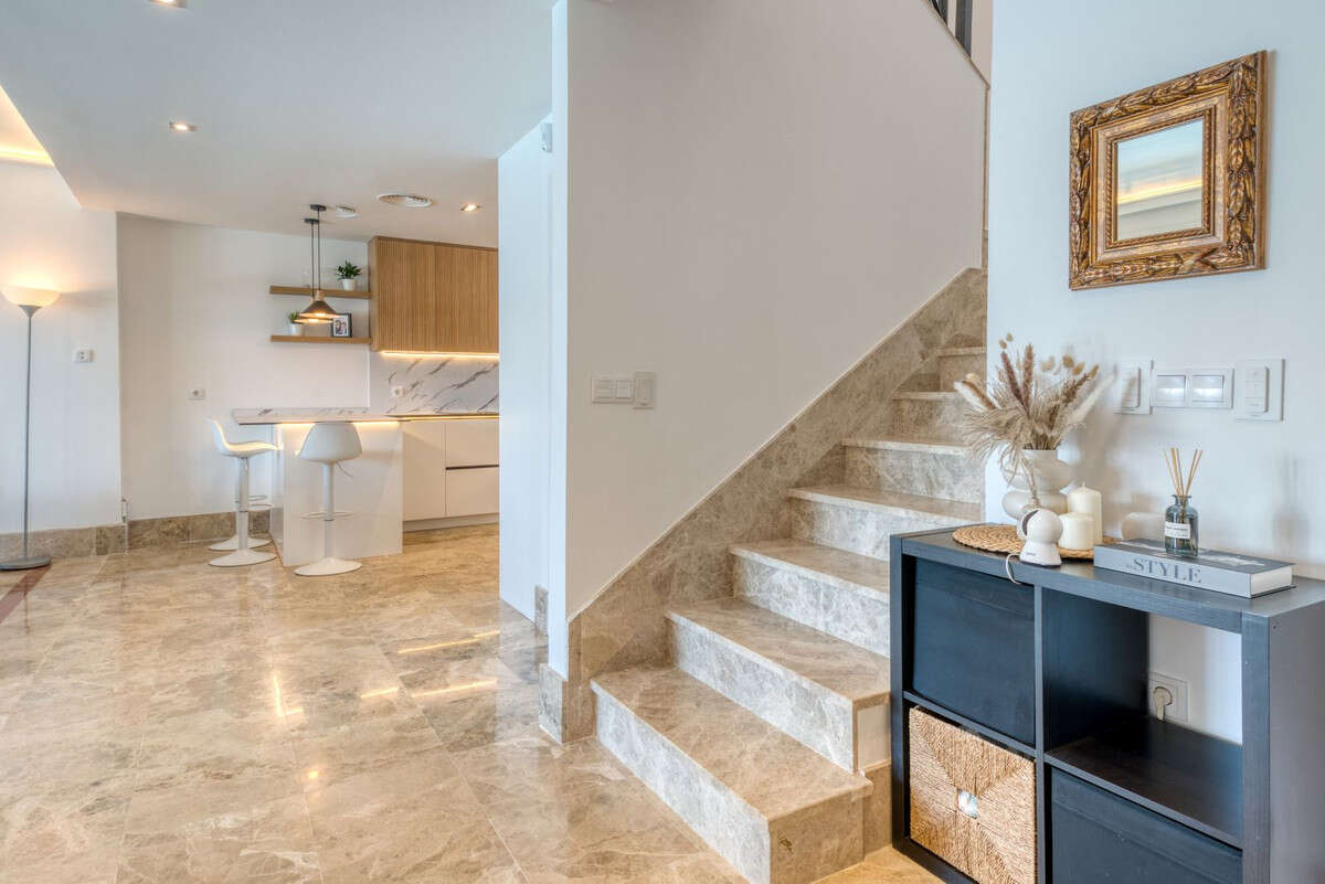 Set within an exclusive residential area in Marbella, this beautifully reformed semi-detached villa combines modern design, advanced technology and energy-efficient living to create a high-quality contemporary home. The interior has been thoughtfully redesigned to offer bright, open-plan living spaces, centred around an elegant living and dining area with a fully integrated kitchen. Large windows maximise natural light and connect seamlessly to the outdoor terraces and garden, while also offering pleasant sea views from the main living areas.