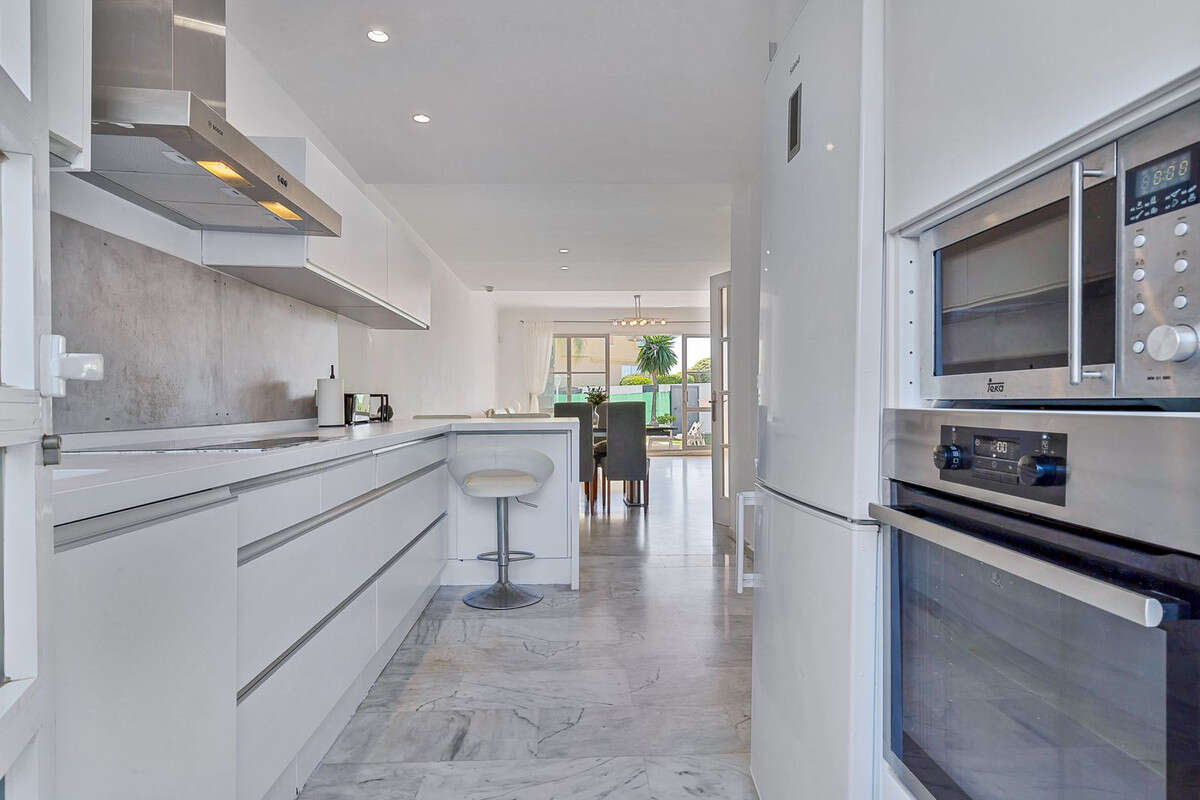 Ground floor: modern fully fitted kitchen open to the living-dining room, with access to a covered terrace and the communal garden, plus a guest toilet.