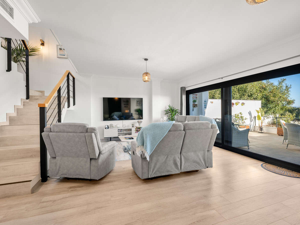 Casa Altavista is a south east facing luxury townhouse for sale with panoramic mountain sea and coastal views. It offers three bedrooms and three ensuite bathrooms within 172 m2 built. The modern spacious kitchen has a view and direct access to the internal patio. Open plan living and dining areas lead to the main terrace with a gate to a small private garden. The home includes air conditioning central heating a wood burning fireplace two private parking spaces and a storage room.