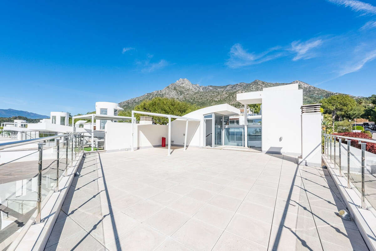 The open-plan living and dining areas flow seamlessly onto covered and uncovered terraces, ideal for entertaining or relaxing in Marbella's privileged climate, while a guest toilet adds further convenience.