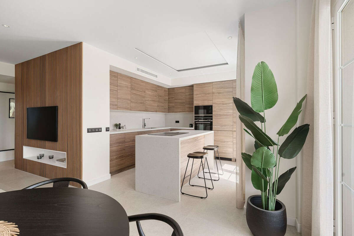 The heart of the home is the open-plan kitchen and living area, bathed in natural light thanks to large windows and seamless indoor-outdoor flow. Step directly from the living room onto a private terrace, perfect for al fresco dining or relaxing with a view. A staircase leads you up to the expansive rooftop solarium, where breathtaking panoramic views over the golf course and surrounding landscape create the ultimate entertaining space.