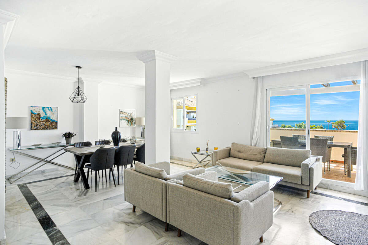 Beautiful south-facing apartment with magnificent sea views, located in the sought-after community of Pinos de Nagüeles, in Marbella's prestigious Golden Mile. Within walking distance to the beach, shops, restaurants, cafés, and the promenade, and just a short drive to golf courses and international schools. This charming corner property enjoys a prime position and consists of three bedrooms and three bathrooms, with the master bedroom en suite. The two upstairs bedrooms each have their own private terrace. There is also a bright and spacious living-dining area and a main private terrace, perfect for relaxing or dining outdoors. The kitchen is fully equipped and designed for functionality, complete with a separate laundry room. The property offers the perfect combination of comfort and location, set within a gated development featuring 24-hour security, beautifully maintained gardens, a paddle/tennis court, clubhouse, and a large communal swimming pool. Additional features include marble flooring, air conditioning, an elevator, an underground parking space conveniently close to the lift, and a bus stop just a few hundred metres from the apartment. The community offers a peaceful yet well-connected environment.