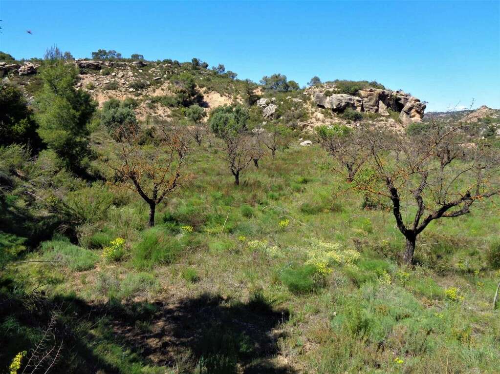 Finca with a total surface area of 30.600 m2, located about 9 kilometers from the village of Maella and also 9 kilometers from the village of Mazaleon. There are olive trees in a private valley, which opens onto a terrace, which is completely surrounded by hilly areas. Because of this there is a lot of privacy. The mas has an area of 84 m2, divided over two floors (2x 42 m2). The walls are standing upright, but the roof has collapsed. The mas is located on a high point of the property and therefore has beautiful views. It is possible to completely renovate the mas. It is a quiet location with lots of privacy. To get to the mas with a car, the road would have to be repaired. We can assist with this, this happens more often. Lake ¨Civan¨ is located 5 kilometers from the finca.