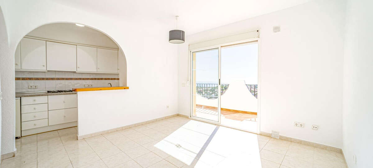Este apartamento forma parte de una urbanización de 200 viviendas que está a aproximadamente a 10 minutos del centro de Calpe y del mar. Este apartamento tiene un dormitorio amplio, baño completo, cocina semi abierta y salón/comedor. Desde el salón se puede salir a una balcón grande con impresionantes vistas al mar y al Peñón d'Ifach