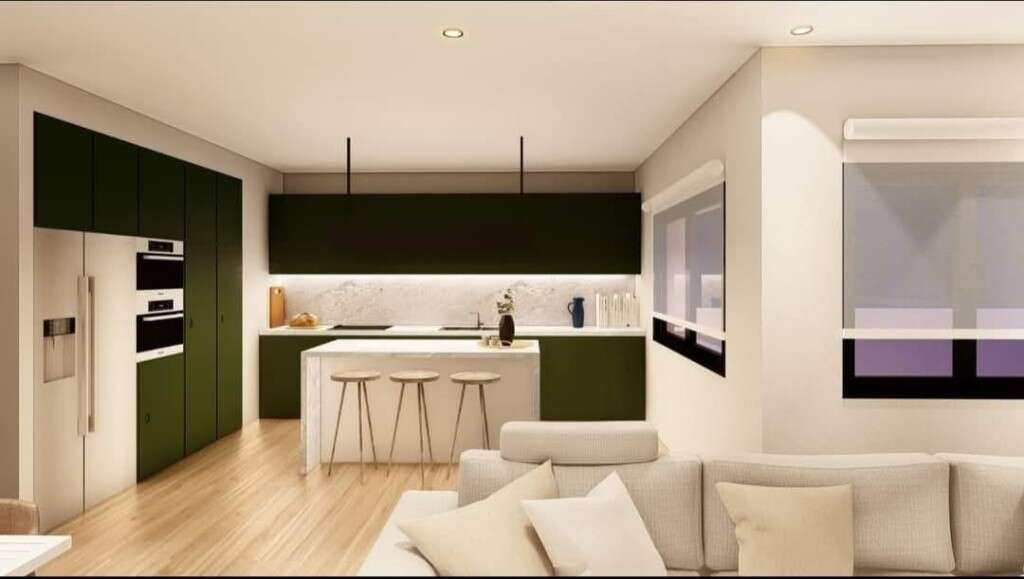 La zona de día está diseñada en concepto abierto, con cocina integrada con isla central, conectada a un amplio salón-comedor que potencia la sensación de amplitud y luminosidad. Desde el salón y el porche se accede directamente al patio, creando una perfecta conexión entre interior y exterior.