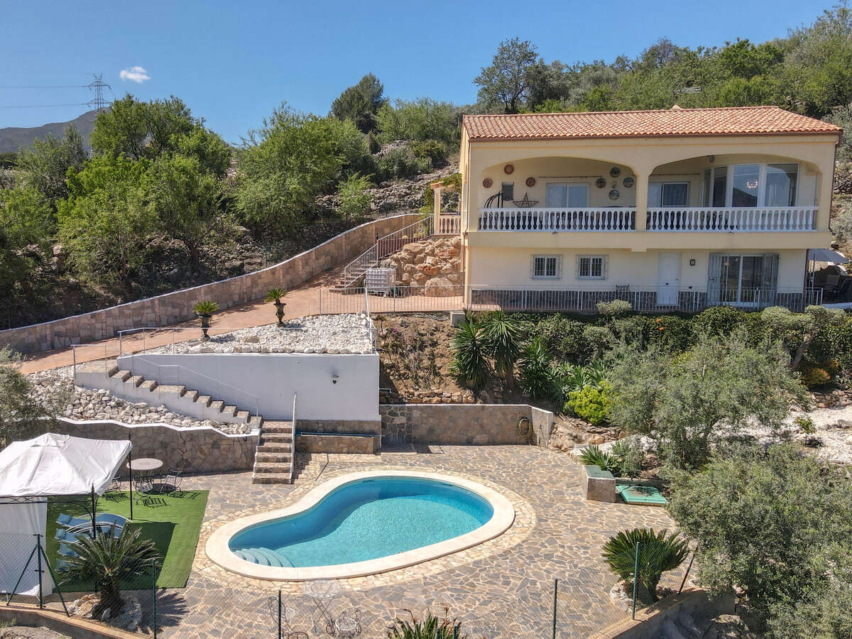 La casa está construida en dos niveles. El alojamiento principal se encuentra en el nivel superior con el apartamento independiente debajo. Una escalera conduce a la puerta principal con acceso a la terraza trasera con sombra. Al entrar a la Villa, uno queda inmediatamente impresionado por la calidad del acabado. A la derecha está el baño de visitas y a la izquierda los 3 dormitorios. Al caminar desde el pasillo hacia el luminoso salón con techos altos y dos juegos de puertas que dan al patio, la habitación se siente luminosa, aireada y acogedora. En la esquina hay una estufa de leña para proporcionar calor en invierno. Ambos juegos de puertas que dan al patio conducen a la gran terraza cubierta que se encuentra al frente de la propiedad, este es el lugar más maravilloso para sentarse, relajarse y disfrutar de las hermosas vistas.