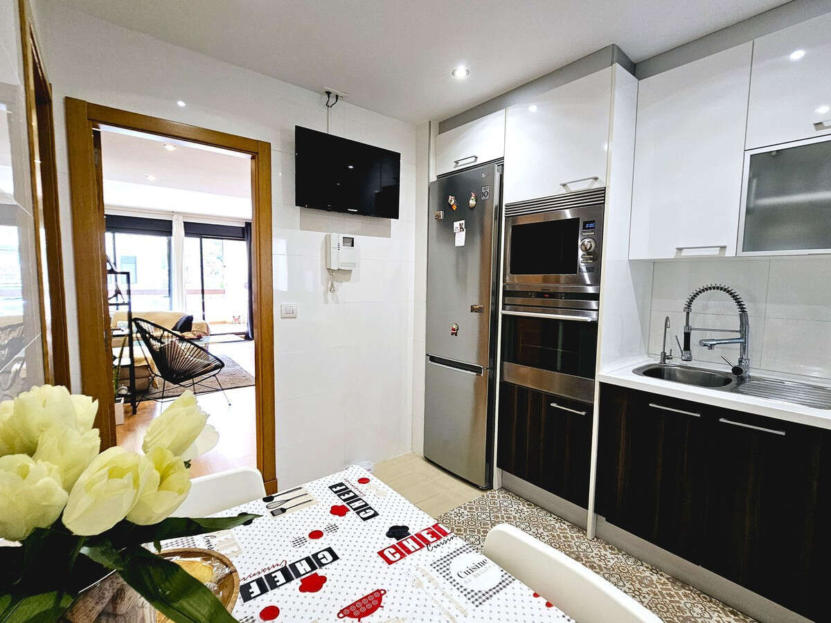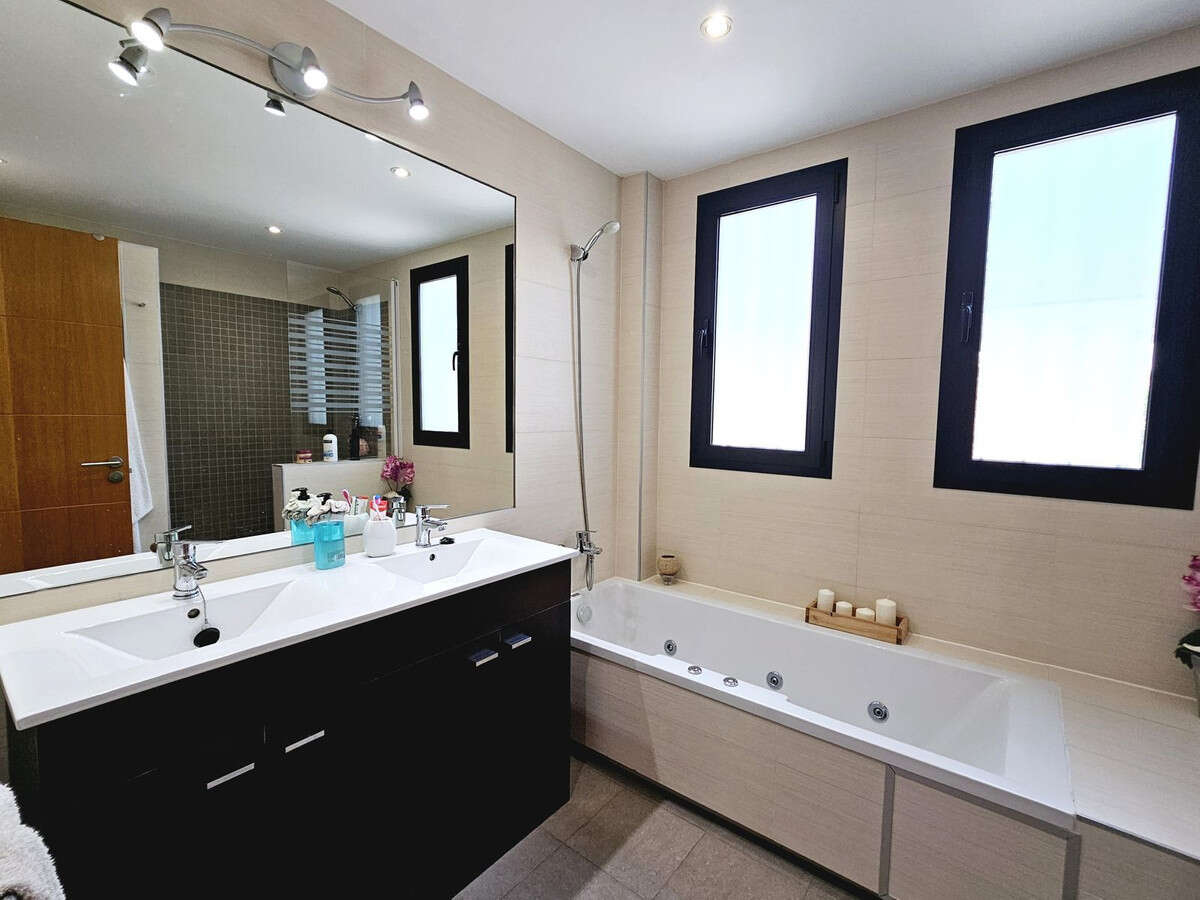 Inside, the apartment features three spacious bedrooms and two bathrooms. The master bedroom boasts an en-suite bathroom with a Jacuzzi bathtub and separate shower, while the other two bedrooms share a generous family bathroom. All bedrooms offer direct access to the lush garden and terrace, ensuring a bright and airy feel throughout.