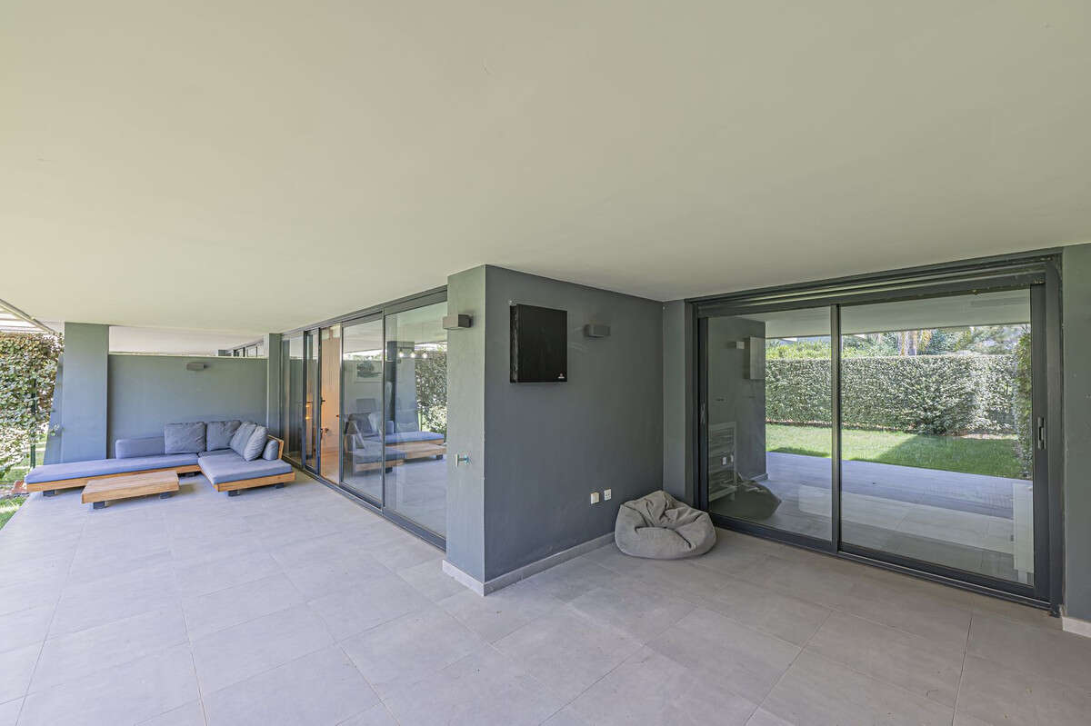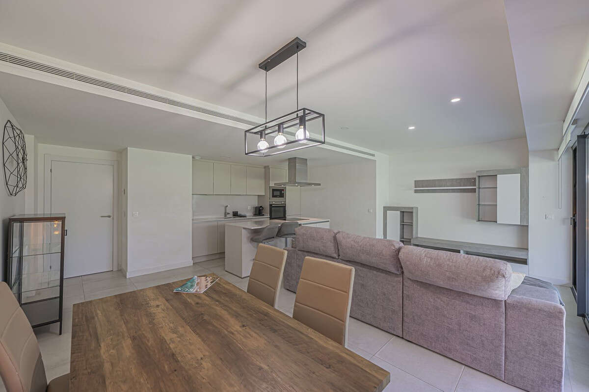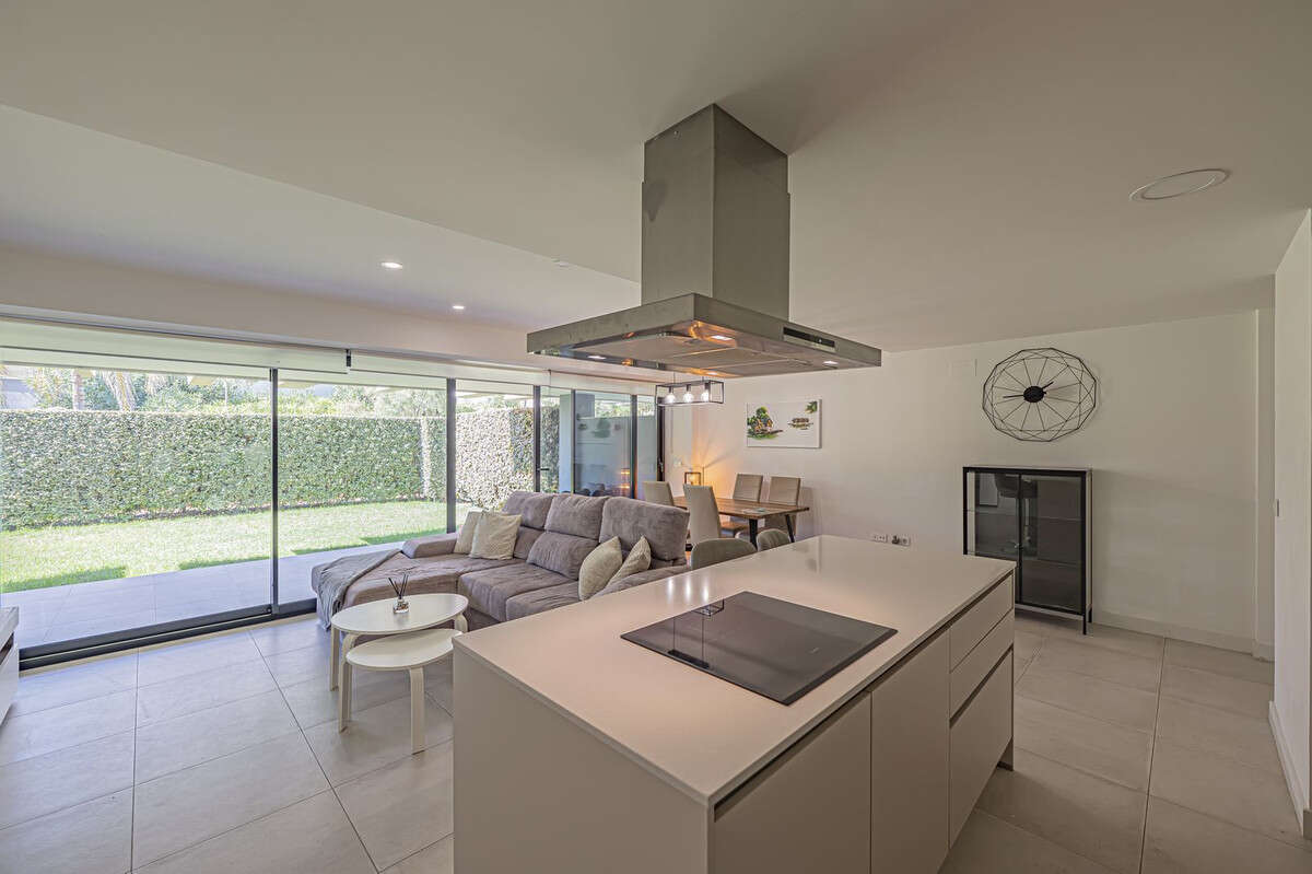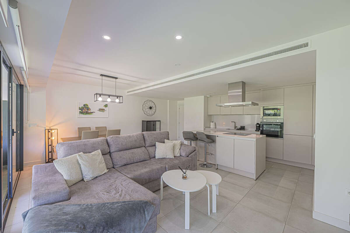 This apartment boasts an elegant modern style, comprising a total of three bedrooms, two bathrooms, a living room with an open kitchen, and a large 33m2 terrace, plus a 63m2 private garden.