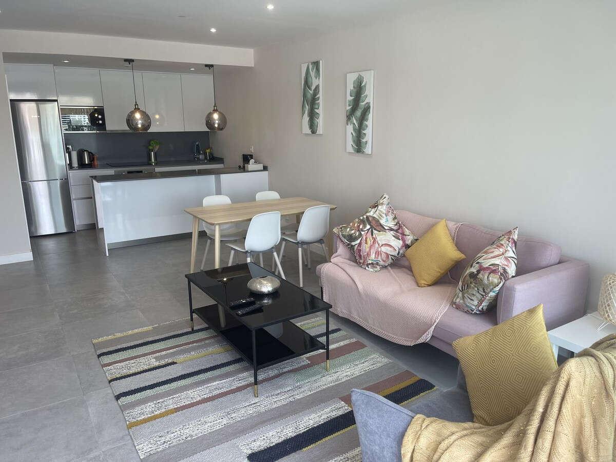 The apartment has 2 double bedrooms and 2 bathrooms one of which is ensuite. Both bedrooms and the lounge area lead out onto the spacious terrace, where you will find a seating area and a dining area. The whole apartment is very well equipped offering a smart TV, hairdryers in both bathrooms, UK plug socket and a safe. The kitchen has everything you will need with modern new appliances.