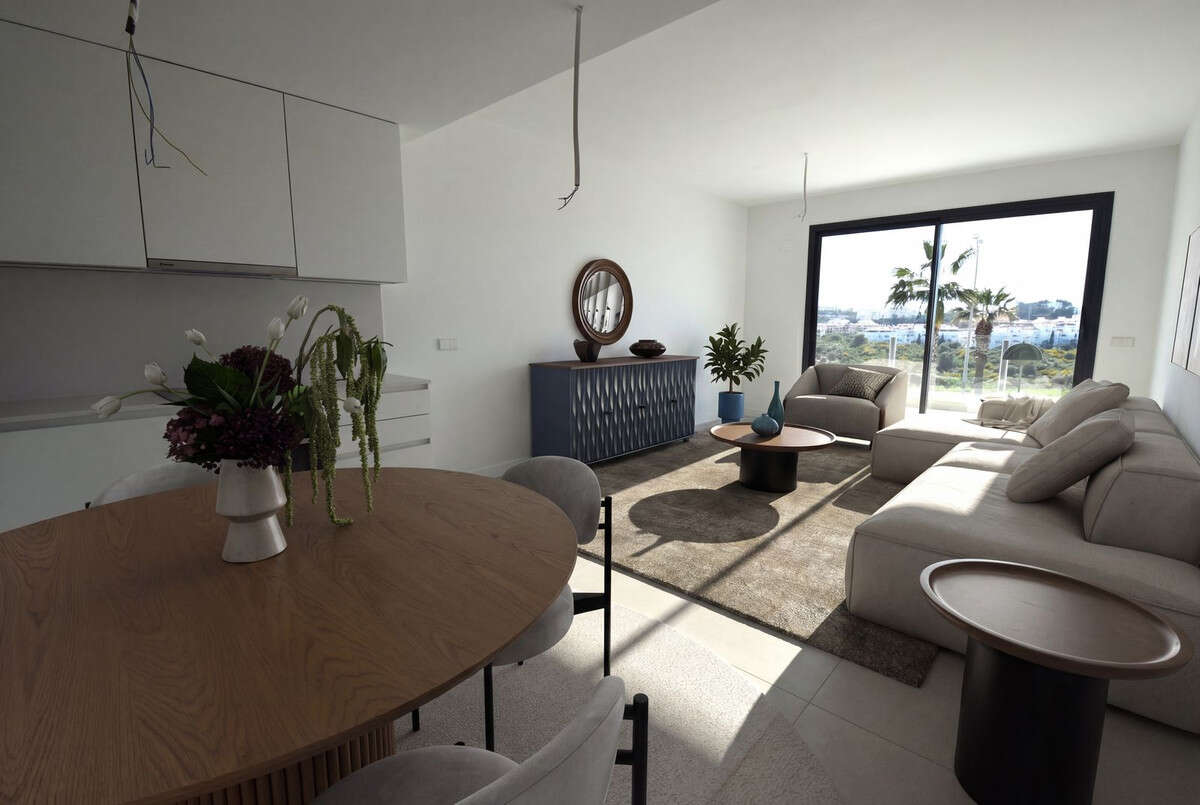 Situated in Calanova Golf, one of the premier locations in La Cala de Mijas, we are pleased to offer this brand new 3 bedroom 2 bath luxury apartment featuring high quality finishes and characterized by cutting-edge architecture. Its innovative design harmoniously incorporates a spacious terrace, allowing the homes to connect with the surrounding landscape and the abundant natural light of Mijas Costa. Located just a few minutes drive from La Cala de Mijas, one of the best towns along the Costa del Sol, this excellent location enables a perfect balance between the serenity of a stunning natural setting and the amenities and entertainment options available in nearby Malaga, Fuengirola, and Marbella. As you enter the apartment you are welcomed by an open plan kitchen/dining/lounge area that has direct access to the southwest facing terrace, with open views of the surrounding countryside and to the sea. The master bedroom also has access to this terrace and the two guest bedrooms are situated on the opposite side of the apartment looking out over the rest of the community. A beautiful deck level communal swimming pool and similar children's pool are in the centre of the community, adjacent to the spacious and well equipped indoor gym and sauna. Also included is an allocated covered parking space and a private storage room.