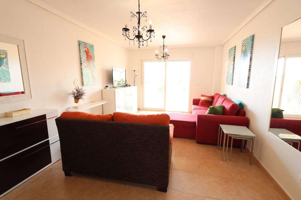 Aguamarina in Campoamor. Corner ground floor apartment , south facing with sea views and facing the communal pool with a large 20 m2 terrace, with direct access to the pool, the house has 70 m2 with 2 bedrooms and 1 bathroom, large independent kitchen with access to the covered patio, the house is sold furnished and with air conditioning and a closed garage, it is located close to all services and a few meters walk to the beach.