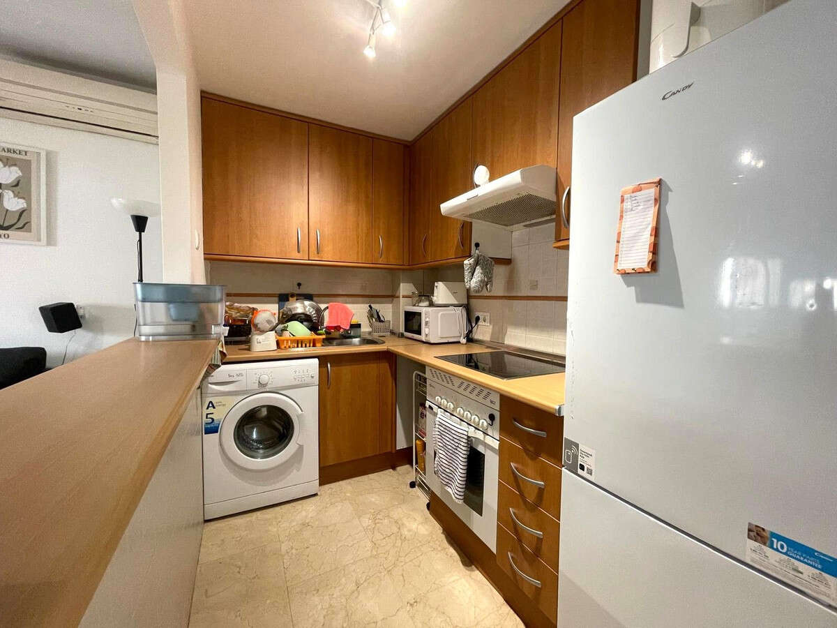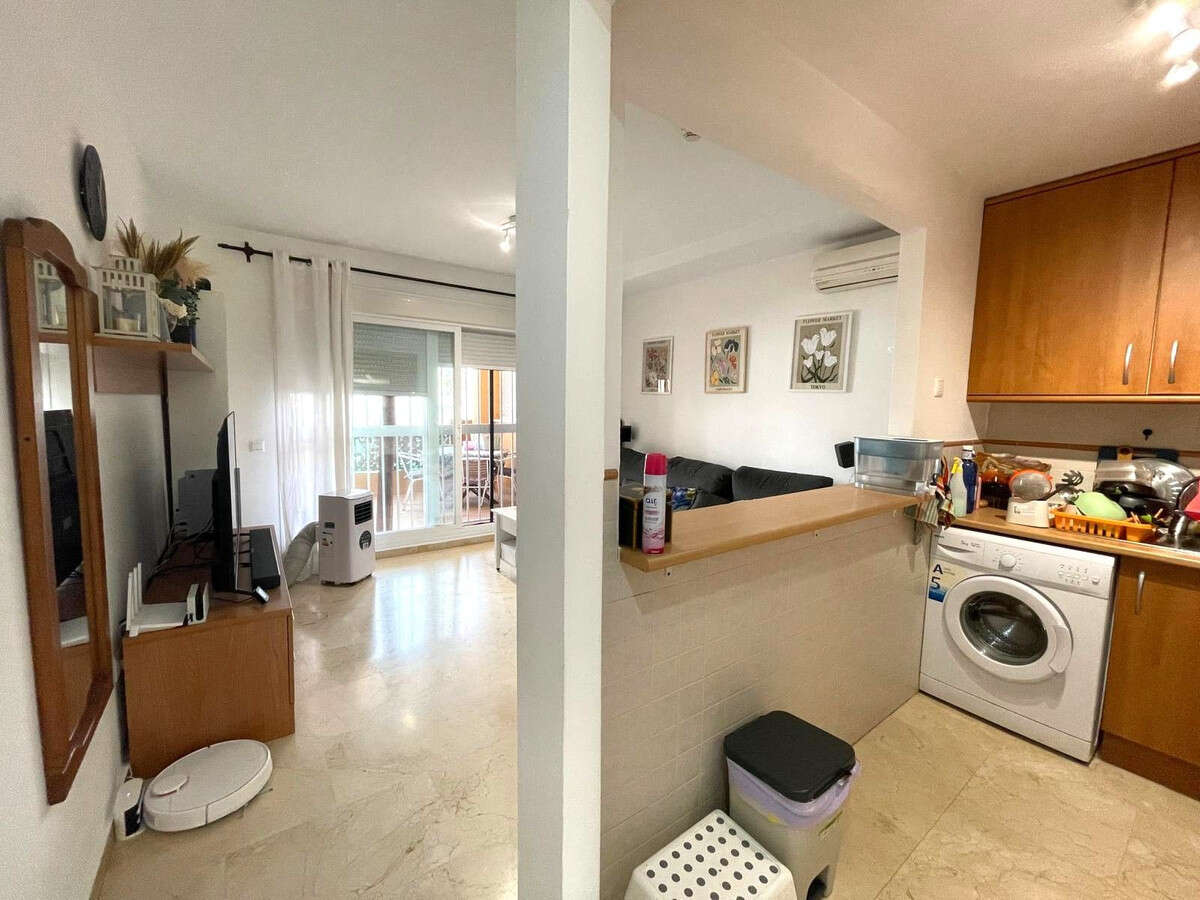 The property features 1 bedroom, 1 full bathroom, an open-plan kitchen connected to a spacious living room, and a private terrace ideal for enjoying the Costa del Sol climate.