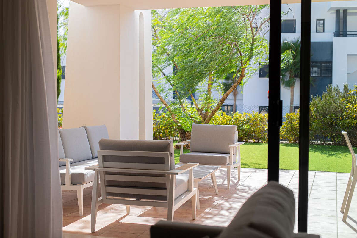 Quality ground floor 3 bedroom, 3 bathroom apartment with large outdoor covered terrace and garden - with Astro-Turf for easy maintenance.