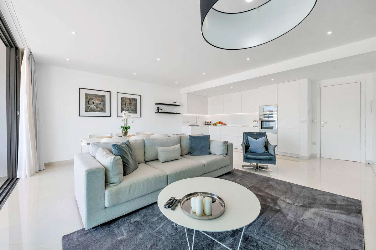 With 91 m² of elegant interior space and an impressive 81 m² terrace, this home is designed for the Mediterranean lifestyle. The spacious open-plan kitchen and living area connect seamlessly to the expansive terrace through floor-to-ceiling sliding glass doors, creating a light-filled environment perfect for both entertaining and relaxation.