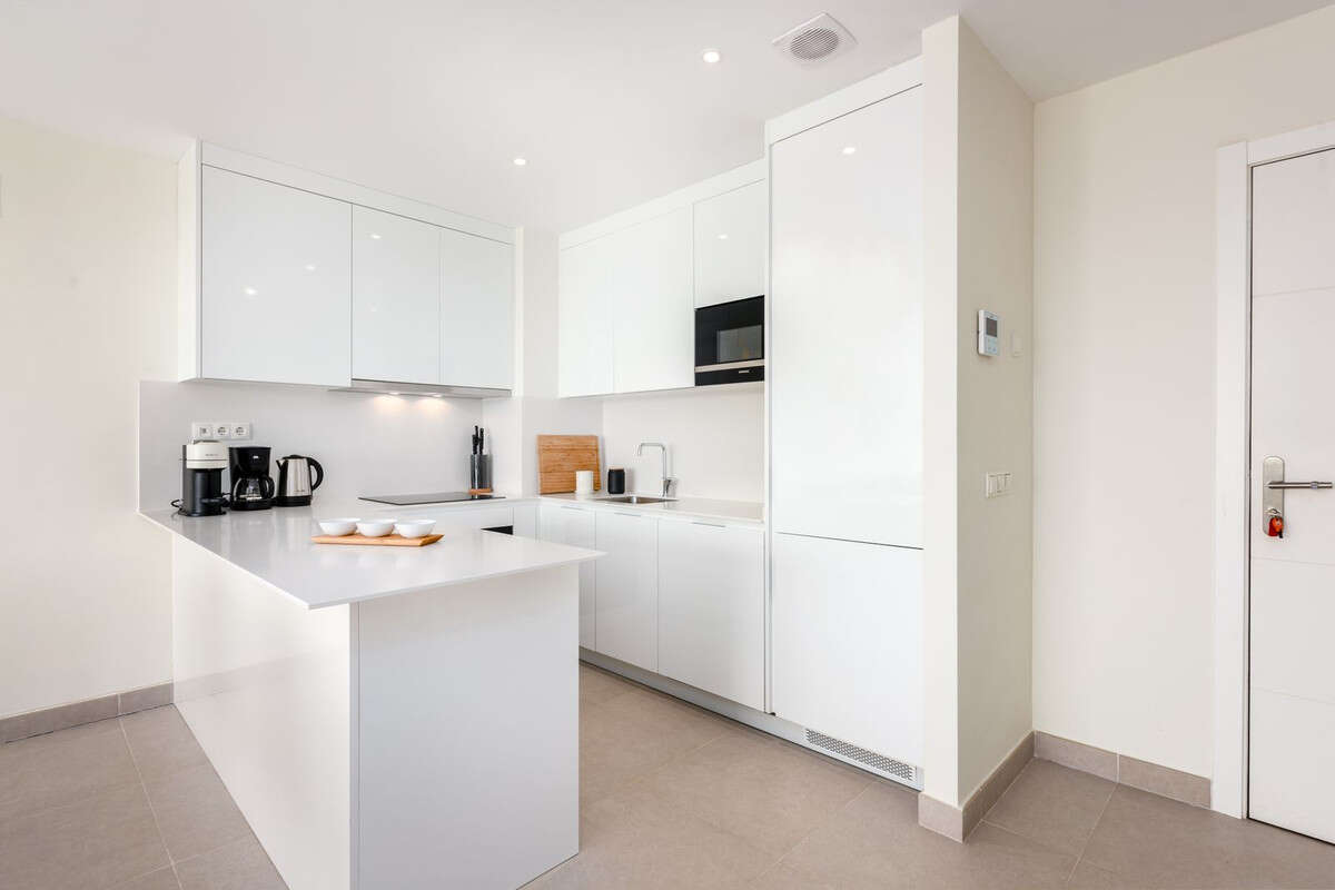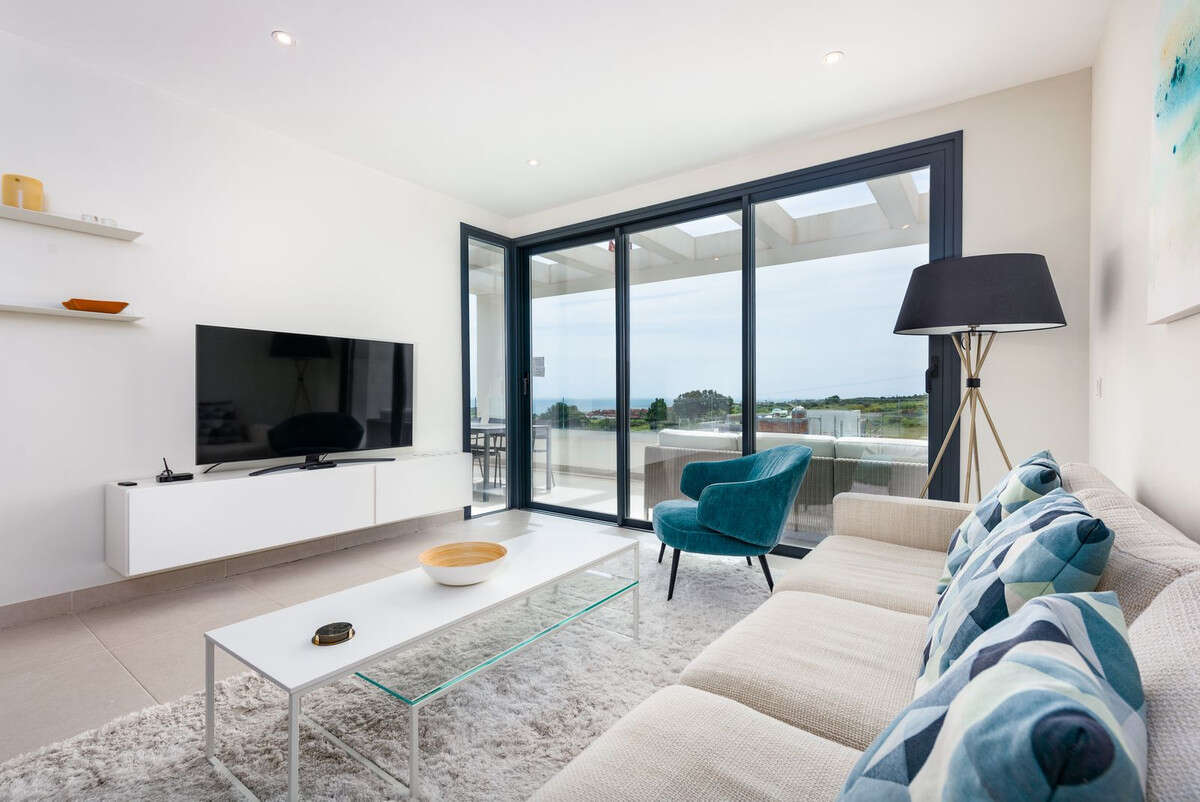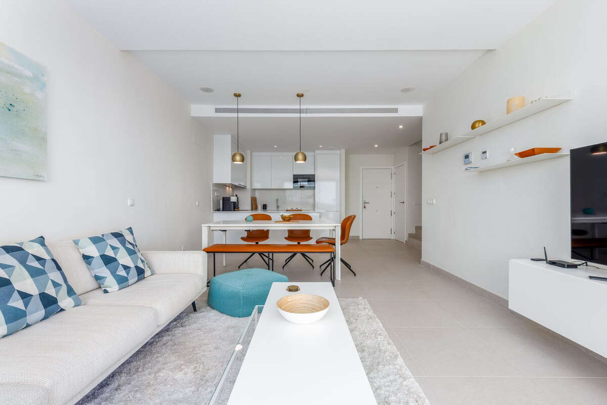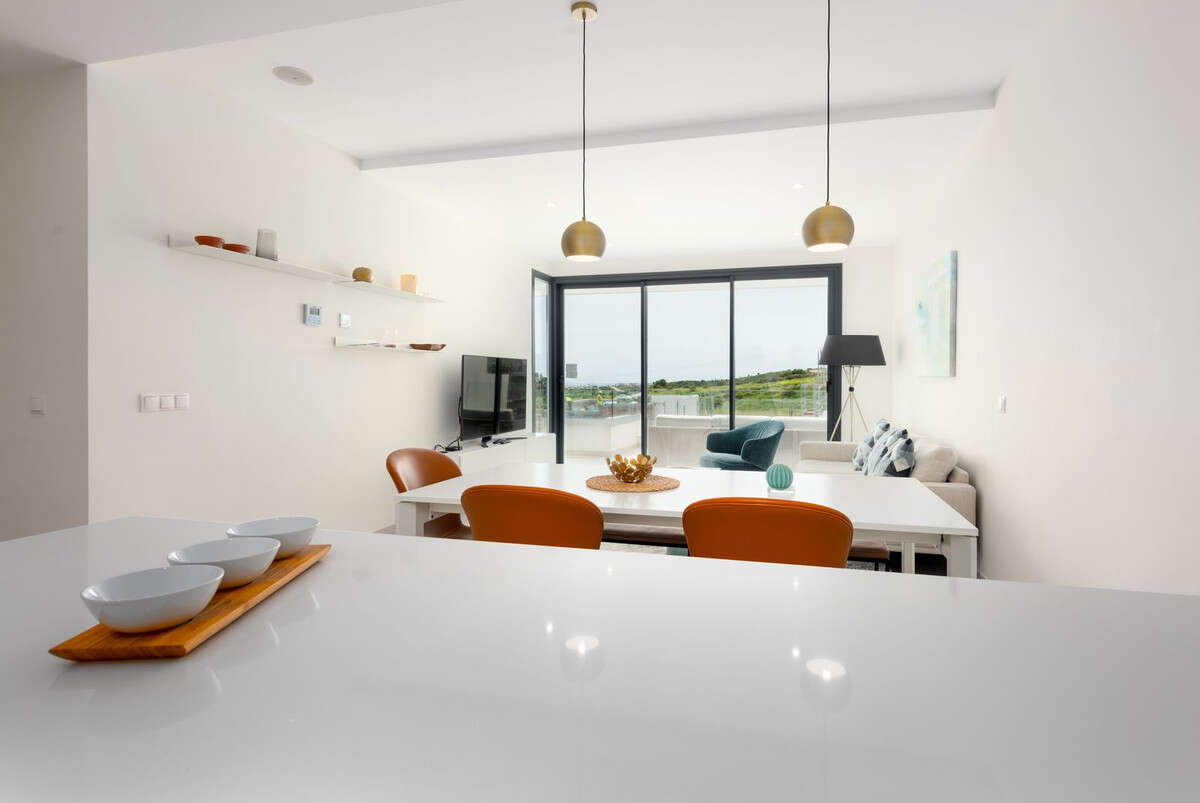 Designed for comfort and modern living, this elegant home features three spacious bedrooms and two contemporary bathrooms, including a master suite with a private terrace and en-suite bathroom. The open-plan kitchen and bright living area flow seamlessly onto two generous terraces, where you can relax and take in panoramic views of the golf course, the Mediterranean Sea, and the surrounding mountains.