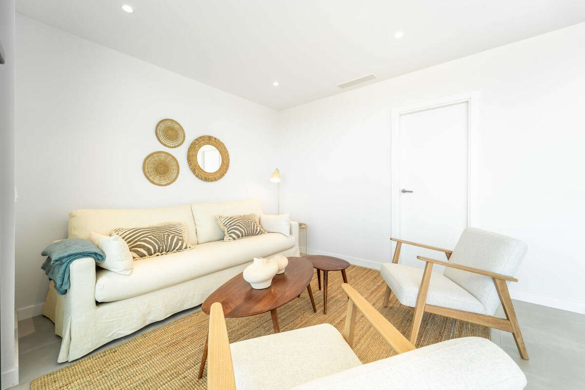 The apartment features two spacious bedrooms and two bathrooms, including a master suite with ensuite layout.. Indoors, comfort is ensured with underfloor heating in the bathrooms, aerothermal climate control, and a modern fitted kitchen. Outdoors, the elevated terrace becomes an extension of the living space — perfect for relaxed mornings, alfresco dining, or evening gatherings.