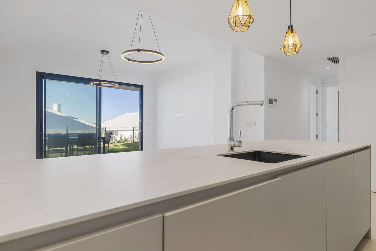 Kitchen and Living Room: The kitchen is modern and open, with high-quality appliances, easy-care countertops, and plenty of storage space. The open-plan living room connects directly to the dining room, creating a perfect setting for family gatherings or gatherings with friends. From the living room, there is direct access to the garden, allowing you to enjoy the views and the outdoors.